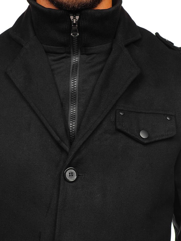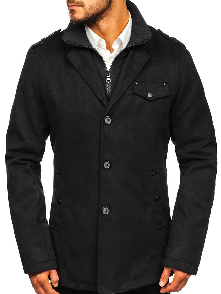 Мъжко зимно палто в черен цвят Bolf 8853 то едноредно палто. Практичен и безкраен, това е безспорен трябва да има в мъжкия гардероб. Черното зимно палто фантастично подчертава както ежедневния образ, така и по-елегантния образ. Той ще бъде идеалното решение за студените дни, перфектно предпазва от студ и вятър. Палтото е закопчано с цип и копчета, има класическа яка и втора яка, която се закопчава под самата врата, за да ви предпази от неприятния студ. Палтото също има грандиозен и стилен джоб на гърдите, който се затваря с клапан и се закрепва върху здрав велкро. Освен това палтото има три практични външни джоба на бутоните и един вътрешен джоб за съхранение на най-ценните неща, тип портфейл или ключове.