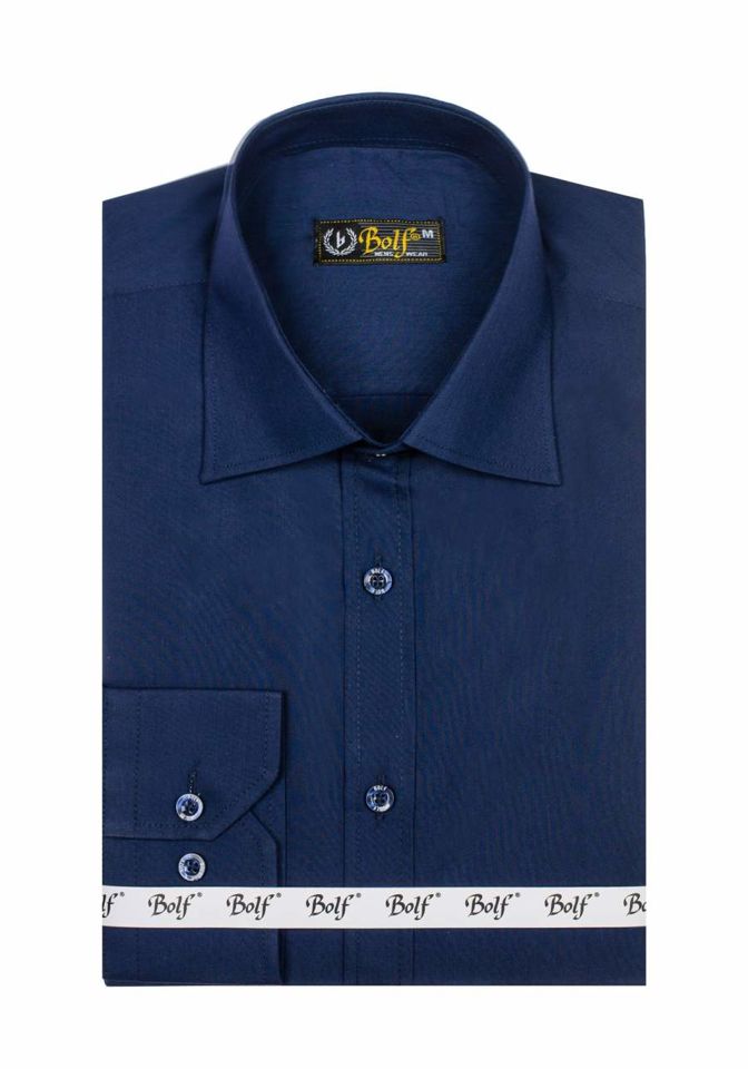 Тъмносиня елегантна мъжка риза с дълъг ръкав Bolf 1703 е артикул, който трябва да присъства в гардероба на всеки, не само на елегантния мъж Този модел се предлага в дузина повече или по-малко интензивни цветове, което улеснява комбинирането им с безброй облекла. Изчистените мъжки ризи са силно препоръчвани за феновете на минимализма и класическата елегантност в модата. Удобни са и много добре ушити. Те са задължителен елемент в гардероба на всеки бизнесмен. Простият класически стил в интересни цветове прави този модел идеален завършек на много ежедневни стилизации. Риза с вталена кройка slim fit, закопчава се с копчета, има практичен заоблен подгъв. Ръкавите са завършени с широки, регулируеми маншети, които се закопчават с едно копче. Има класическа яка с къси ревери.