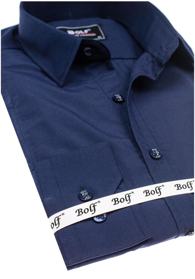 Едноцветни, тъмносини мъжки ризи с прилепнал крой Bolf с класическа яка Kent. Перфектна с вратовръзка, сако и по-ежедневен стил. Тъмносинята риза с дълъг ръкав е в неутрален цвят и приятно изтънява фигурата, като подчертава раменете. Задължителен елемент във всеки мъжки гардероб.