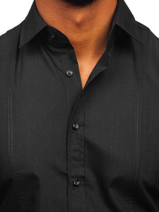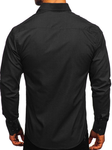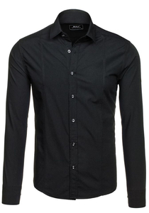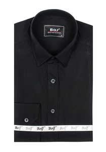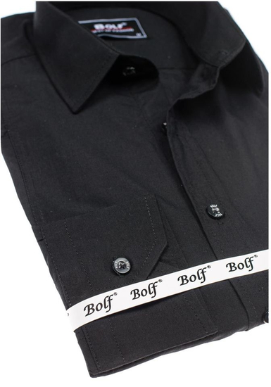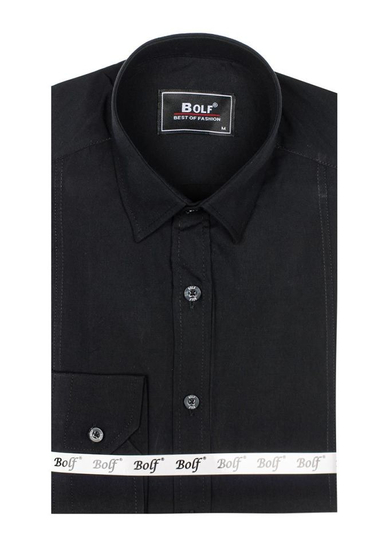 Мъжка изчистена черна вталена риза Bolf с класическа яка тип Кент. Перфектна с вратовръзка, сако и по-ежедневен стил. Черната риза с дълъг ръкав е в неутрален цвят, приятно вталява и подчертава раменете. Задължителен елемент във всеки мъжки гардероб.