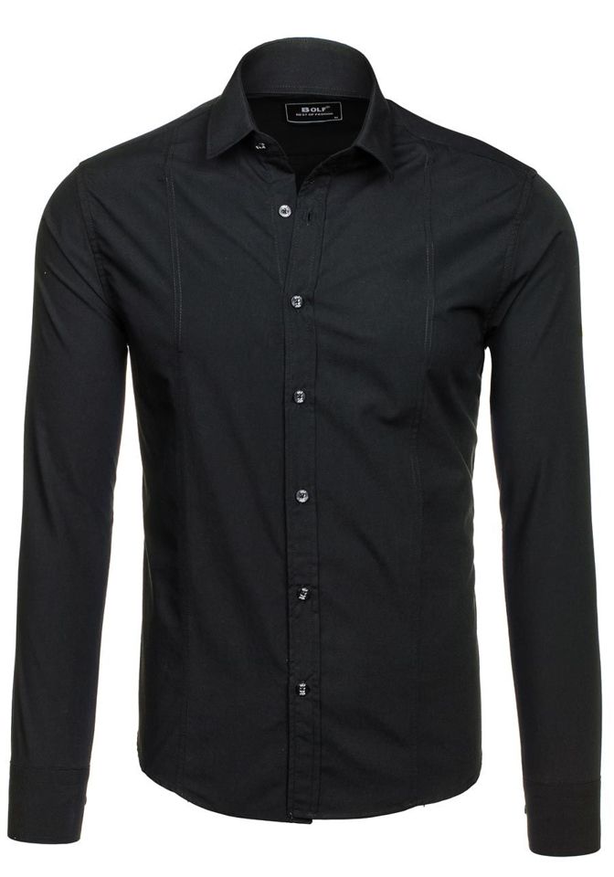 Мъжка изчистена черна вталена риза Bolf с класическа яка тип Кент. Перфектна с вратовръзка, сако и по-ежедневен стил. Черната риза с дълъг ръкав е в неутрален цвят, приятно вталява и подчертава раменете. Задължителен елемент във всеки мъжки гардероб.