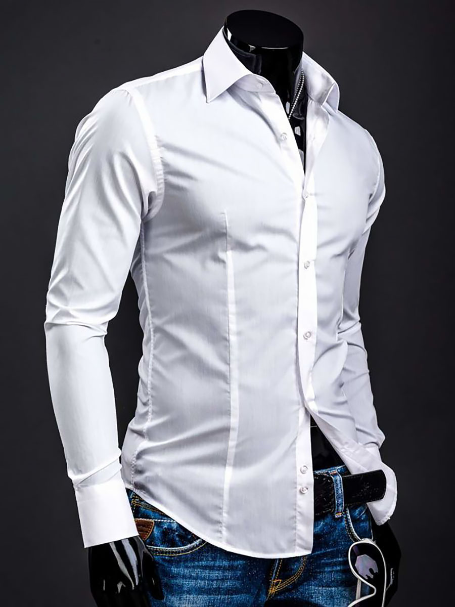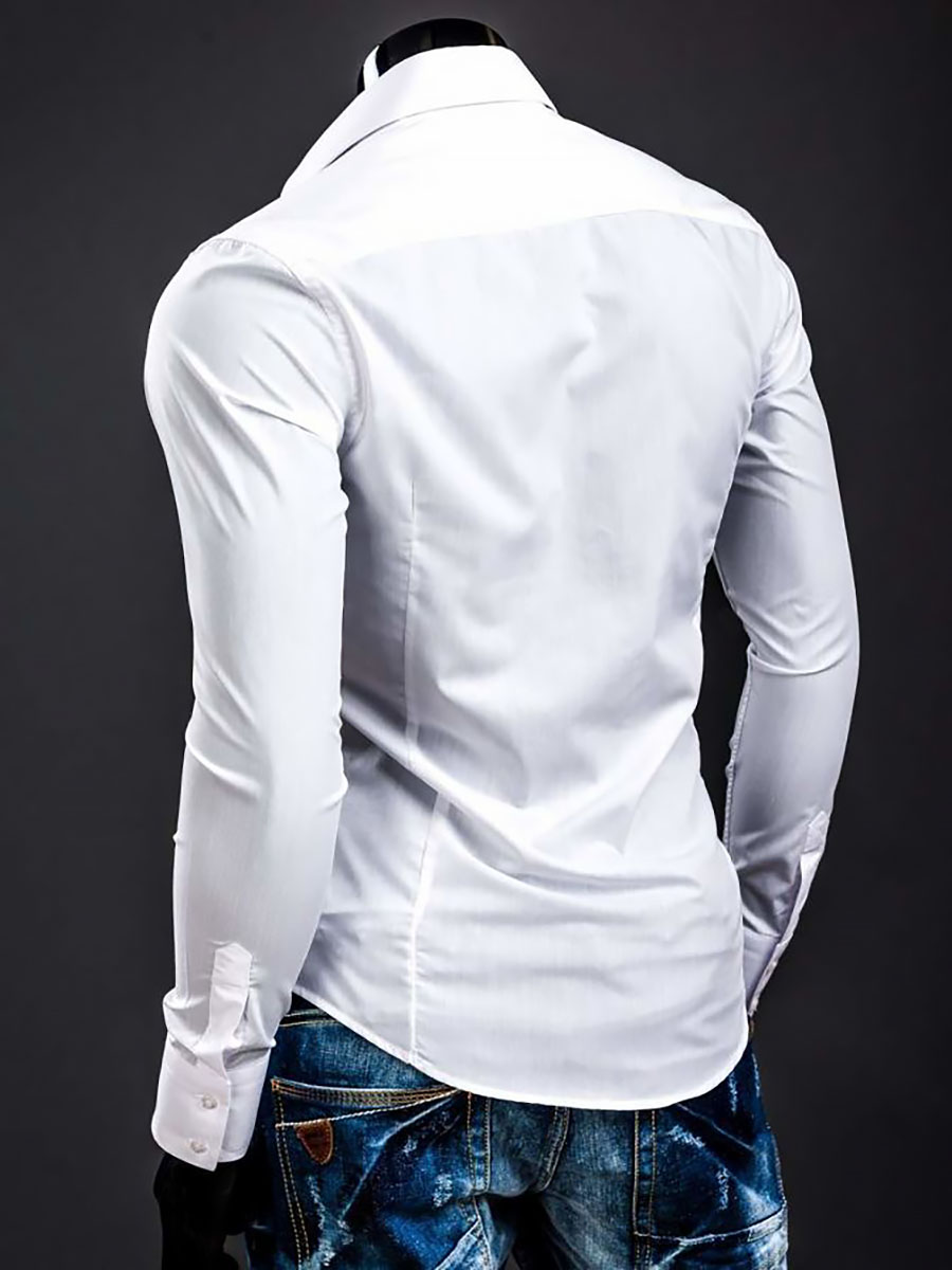 Бяла елегантна мъжка риза с дълъг ръкав Bolf 1703A е артикул, който трябва да присъства в гардероба на всеки, не само на елегантния мъж Този модел се предлага в дузина повече или по-малко интензивни цветове, което улеснява комбинирането им с безброй облекла. Изчистените мъжки ризи са силно препоръчвани за феновете на минимализма и класическата елегантност в модата. Удобни са и много добре ушити. Те са задължителен елемент в гардероба на всеки бизнесмен. Простият класически стил в интересни цветове прави този модел идеален завършек на много ежедневни стилизации. Риза с вталена кройка slim fit, закопчава се с копчета, има практичен заоблен подгъв. Ръкавите са завършени с широки, регулируеми маншети, които се закопчават с едно копче. Има класическа яка с къси ревери.