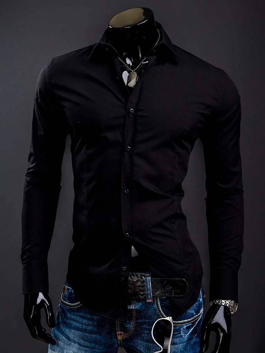 Черна елегантна мъжка риза с дълъг ръкав Bolf 1703A е артикул, който трябва да присъства в гардероба на всеки, не само на елегантния мъж Този модел се предлага в дузина повече или по-малко интензивни цветове, което улеснява комбинирането им с безброй облекла. Изчистените мъжки ризи са силно препоръчвани за феновете на минимализма и класическата елегантност в модата. Удобни са и много добре ушити. Те са задължителен елемент в гардероба на всеки бизнесмен. Простият класически стил в интересни цветове прави този модел идеален завършек на много ежедневни стилизации. Риза с вталена кройка slim fit, закопчава се с копчета, има практичен заоблен подгъв. Ръкавите са завършени с широки, регулируеми маншети, които се закопчават с едно копче. Има класическа яка с къси ревери.