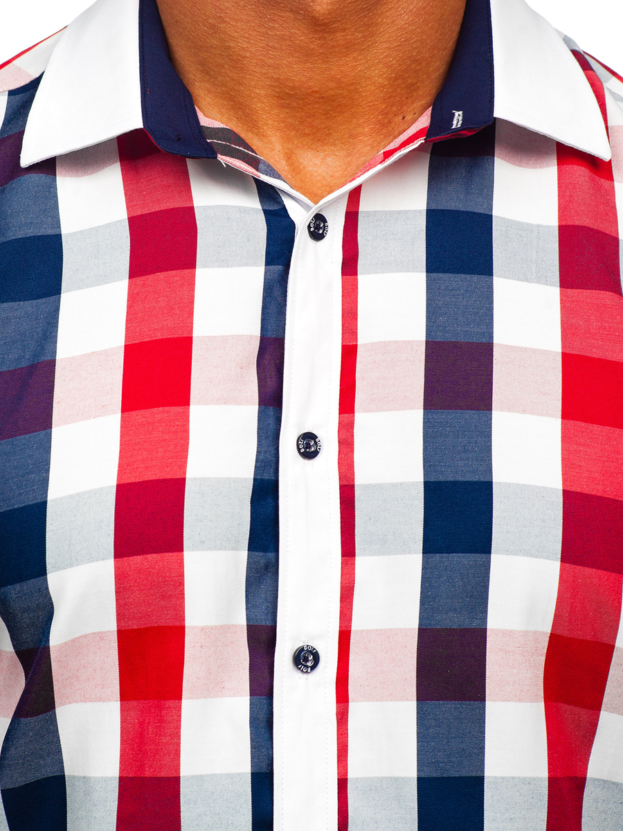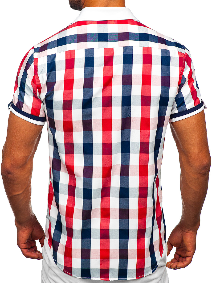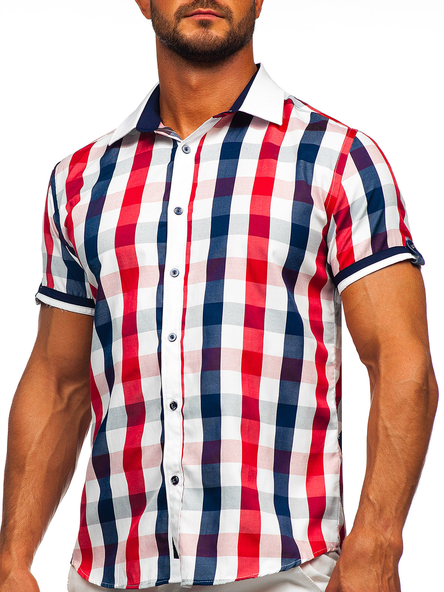 Червена мъжка карирана риза Bolf с контрастна, бяла яка. Леки, прилепнали, невероятно удобни. Червената мъжка риза slim fit с къс ръкав е must have. Незаменимa за красива стилизация с шорти, панталони чино и спортни обувки slip-on или мокасини.