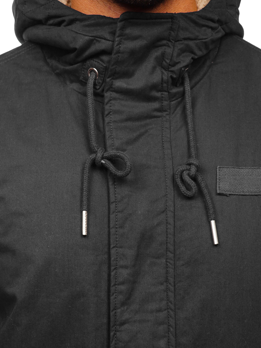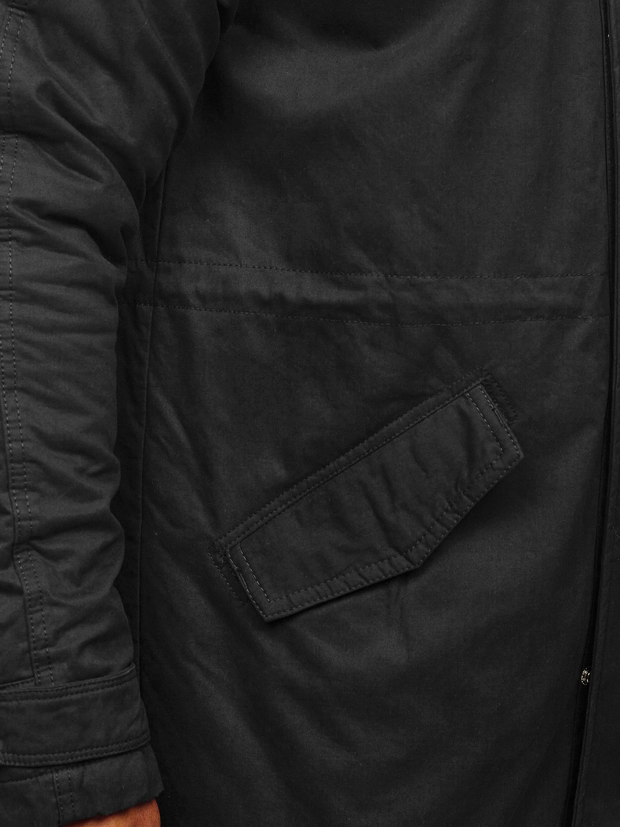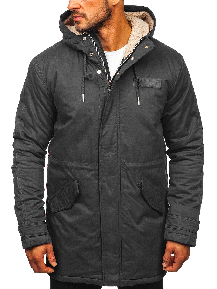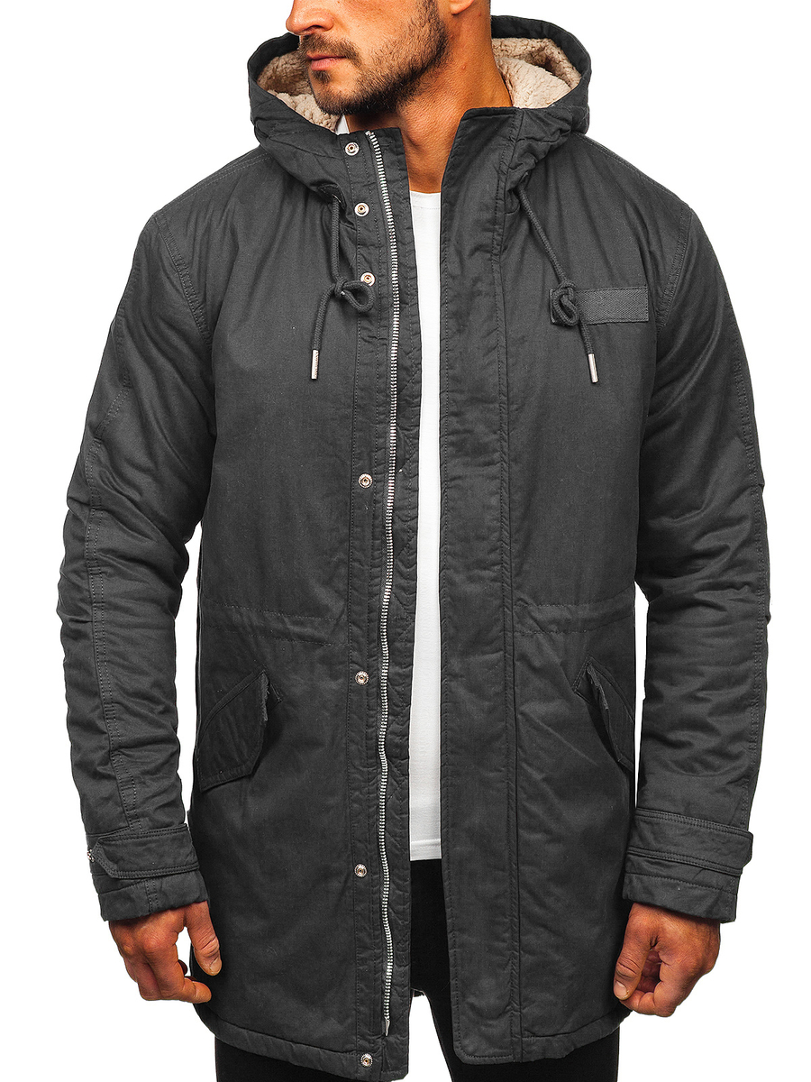 Графитено мъжко зимно яке тип парка EX838. Продуктът е с цип, ръкавите се регулират с тик-так копче, подплатена топла качулка, два външни джоба със закопчаване. Якето осигурява отлична защита срещу студ и вятър. Материята, от която е изработено, и кройката го правят изключително топло. Заобленият и удължен долен подгъв отзад придава характер. Якето тип парка перфектно се адаптира към фигурата, ушито е от висококачествени материали.