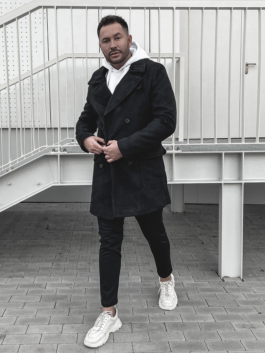 Черно зимно палто 1048B. Двуреден модел, с топла подплата, закопчаване с копчета. Палтото има яка с ревери, два външни джоба с капаче, закопчавани с тик-так копче, един вътрешен джоб с копче. Допълнително предимство на палтото са декоративните копчета на ръкавите. Вталената кройка придава характер на аутфита.