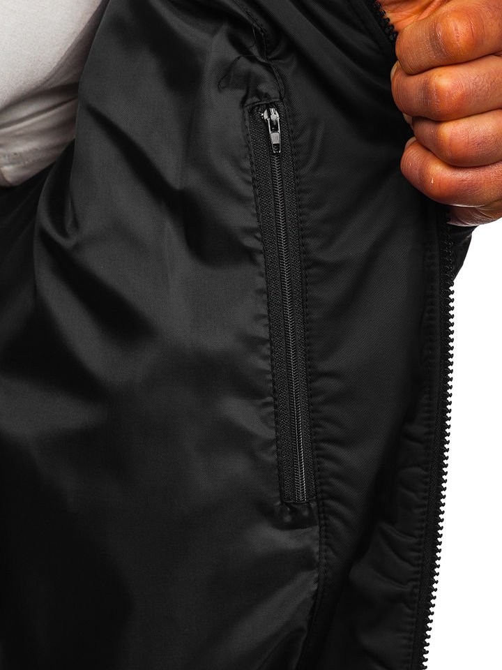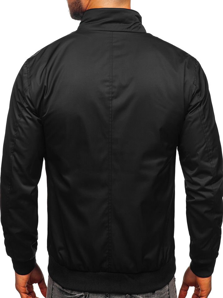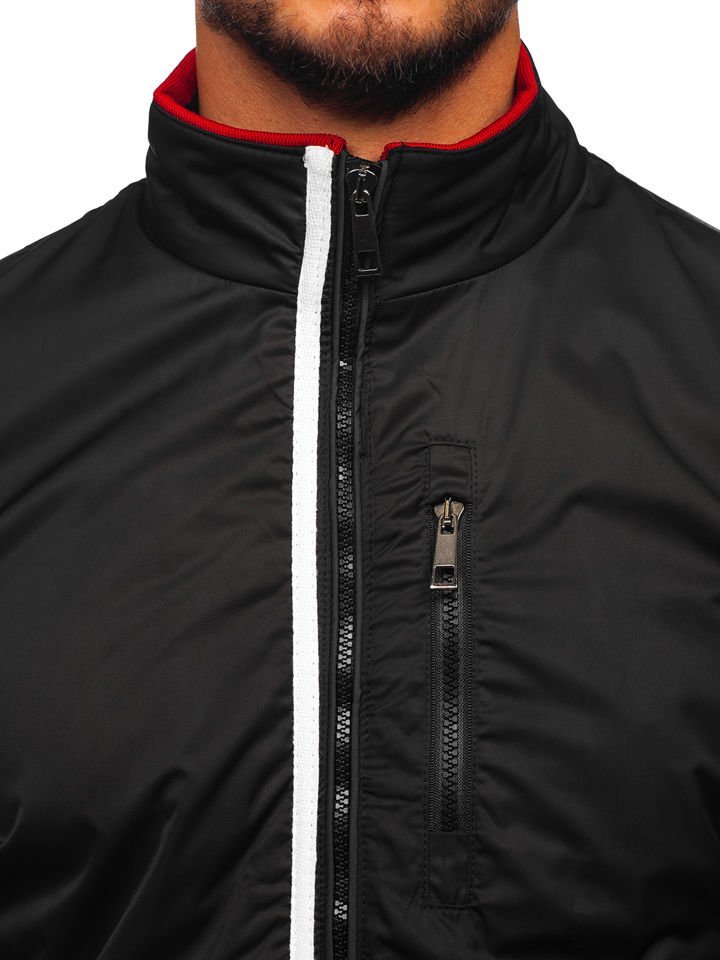 Черно мъжко преходно яке K01. Моделът е сцип, вдигната яка, три външни джоба с цип и един вътрешен. Яката, ръкавите и долният подгъв са завършени с щрик. Характер на якето придават, контрастиращите детайли в червено и бяло. Простият фасон прави якето подходящо за модни спортни аутфити.