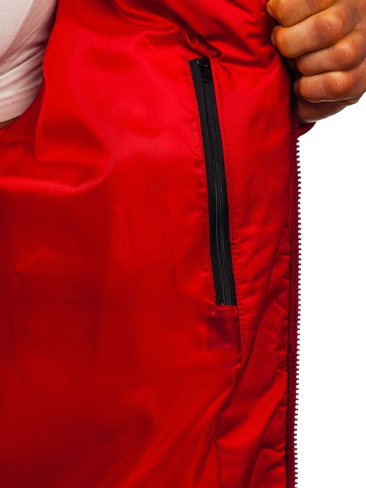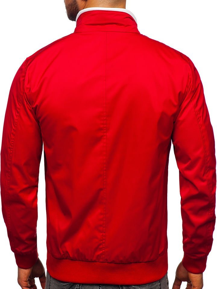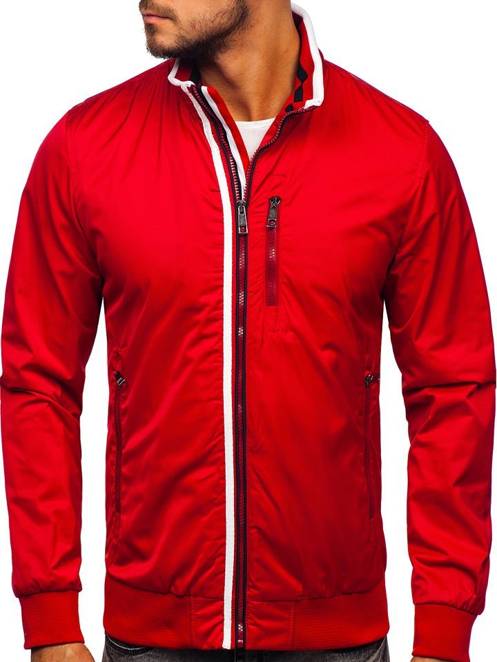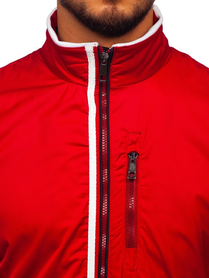 Червено мъжко преходно яке K01. Моделът е сцип, вдигната яка, три външни джоба с цип и един вътрешен. Яката, ръкавите и долният подгъв са завършени с щрик. Характер на якето придават, контрастиращите детайли в бяло и черно. Простият фасон прави якето подходящо за модни спортни аутфити.