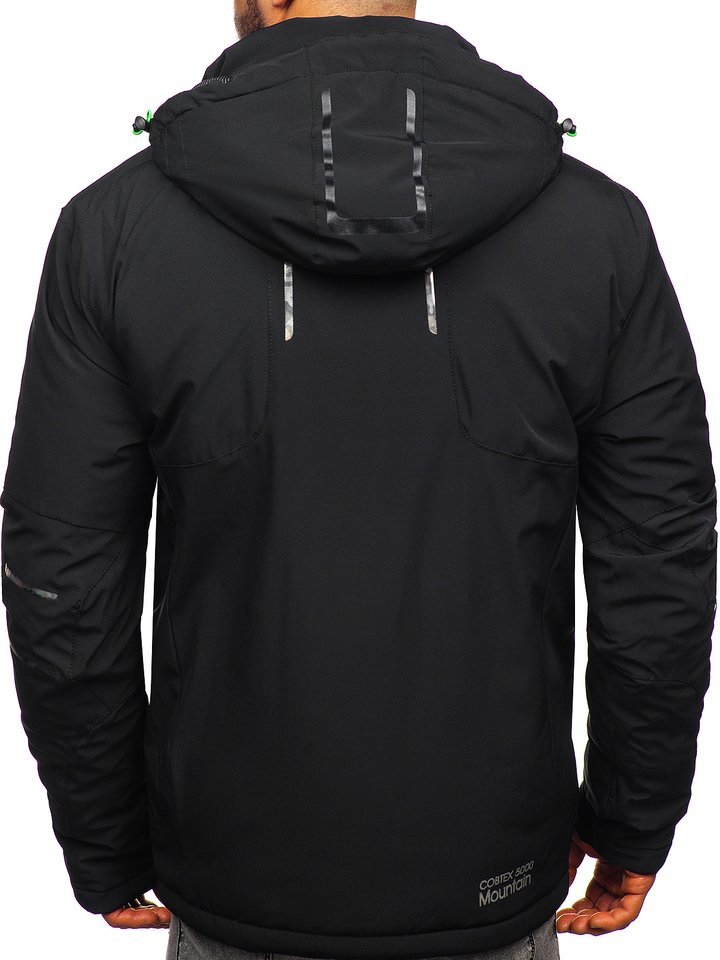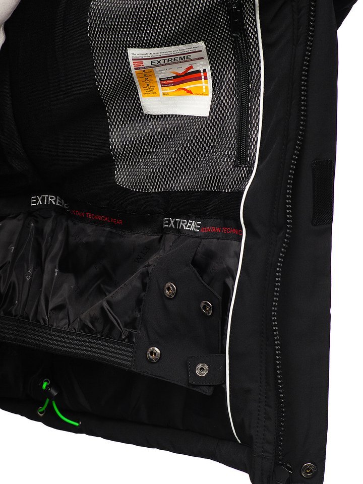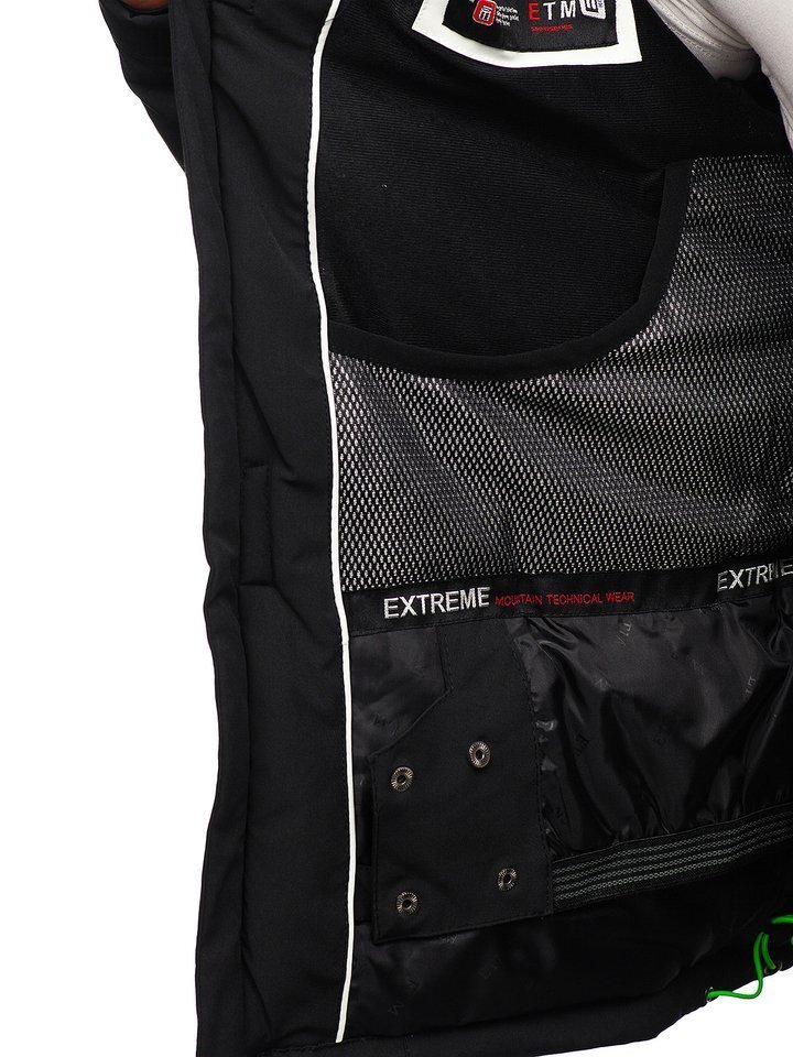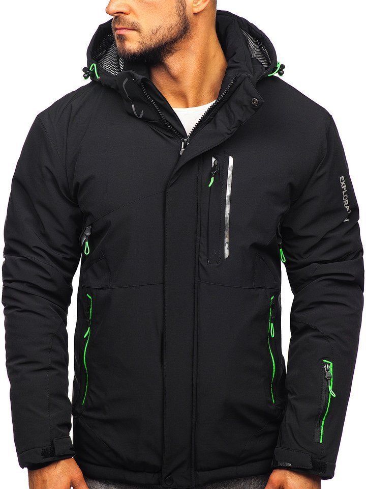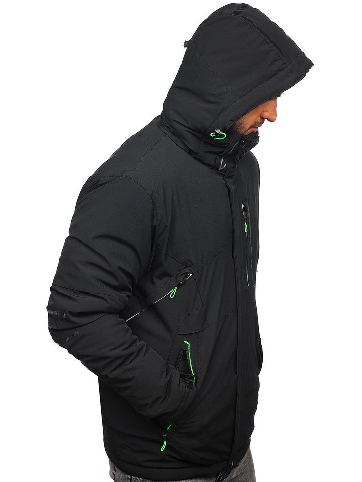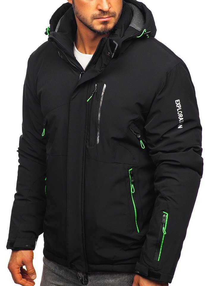 Мъжко зимно яке скиорско черно-зелено 1910. Продуктът има забележително практични предимства, т.е. вдигната яка закопчавана с цип и тик-так копче, регулируема, сваляща се качулка, отвори за проветрение отстрани, вътрешен джоб за телефон, ръкави, завършени с щрик, външни джобове с цип, вертикален джоб на гърдите. Характер на якето му придават детайлите в контрастиращ, зелен цвят и принтовете на ръкавите. Скиорското яке е идеално за зимна почивка. Осигурява перфектна защита от студ и вятър, без да ограничава движенията. Благодарение на интересните, полезни технологични решения и класическата кройка, този модел може успешно да се използва дори няколко сезона.