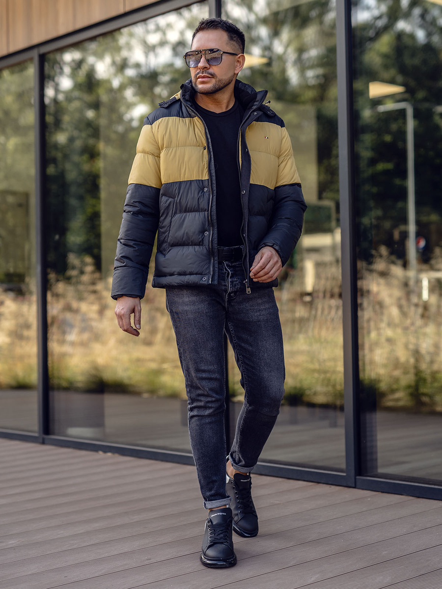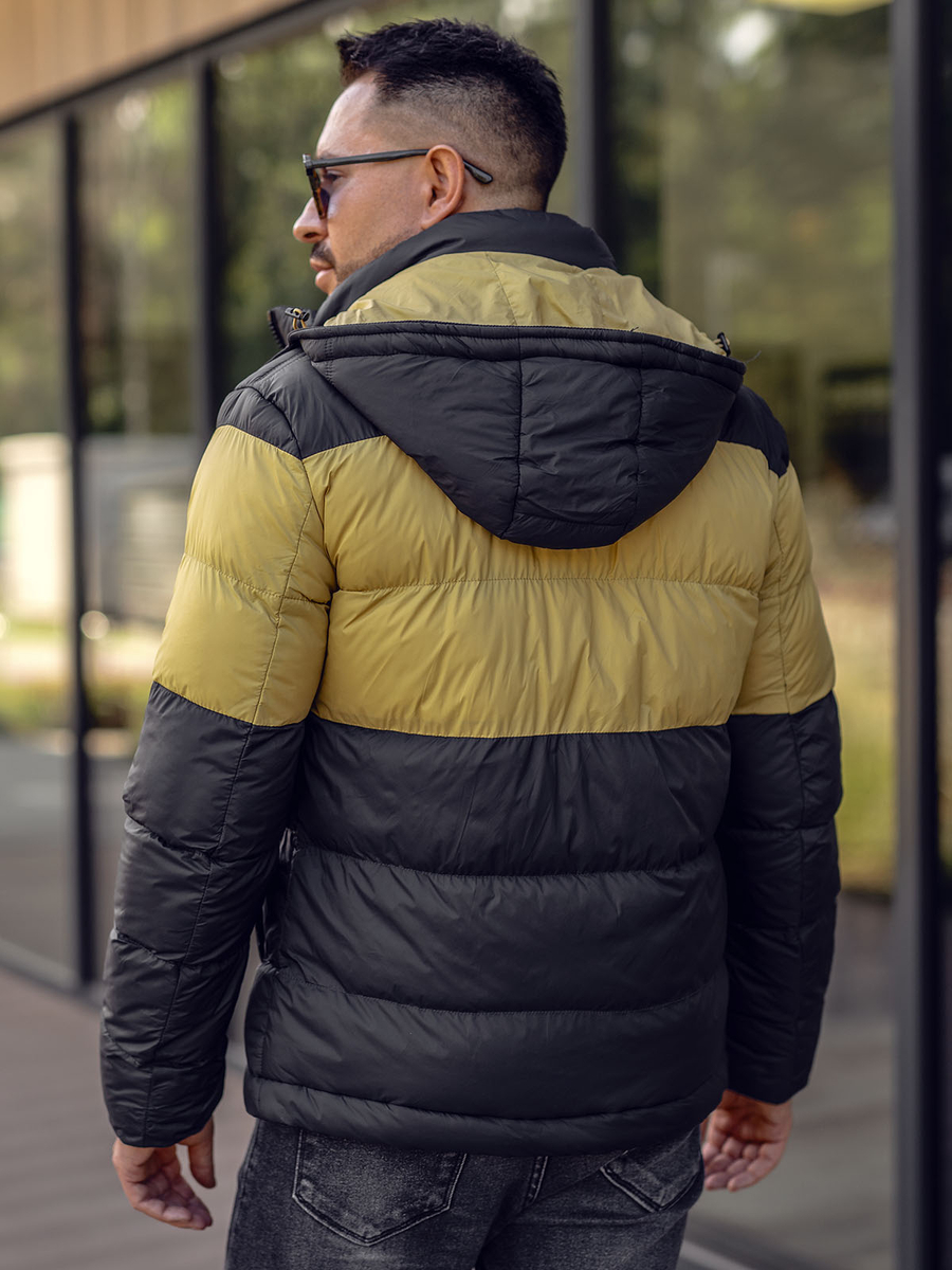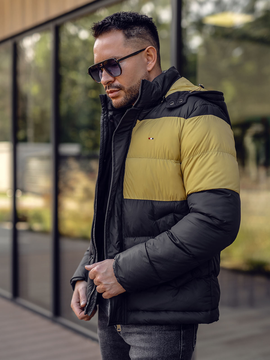 Черно мъжко зимно спортно яке 1975. Моделът е с хоризонтално капитониране, регулируема качулка, бродерия на лявата гърда, два външни джоба с тик-так копчета, един вътрешен джоб и вдигната яка. Характерна черта на якето е съчетанието на два цвята – черен и жълт. Това мъжко яке е идеален избор за тези от нас, които ценят модата и удобството.