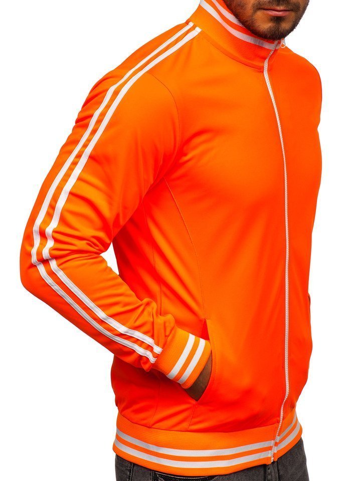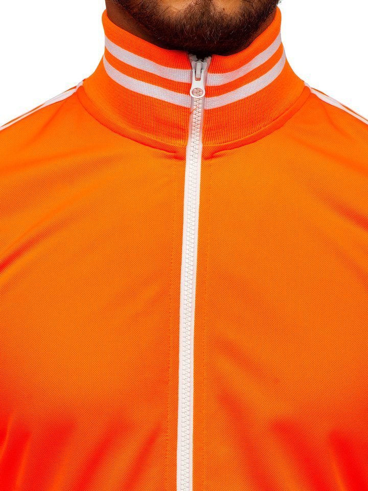 Оранжев мъжки суитшърт с цип без качулка в ретро стил 11113 . Моделът е с вдигната яка, два странични джоба и щрикове на долния подгъв и ръкавите. Декоративен елемент на суитшърта е белият цип, белият кант на ръкавите и бялата линия на щриковете. Интересната цветова схема ще ви накара да се откроите от тълпата.