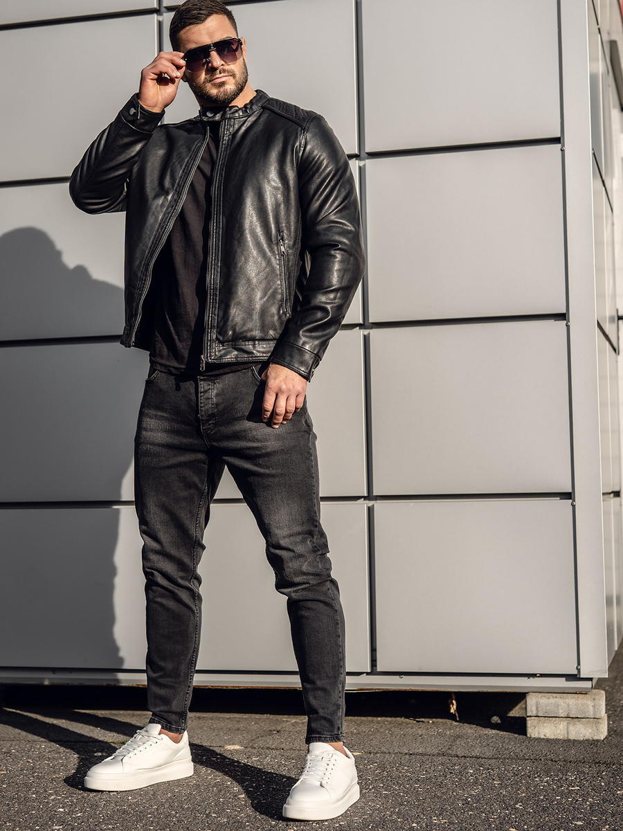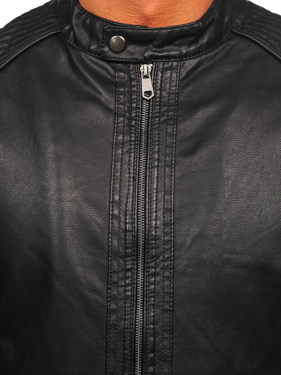 Черно мъжко кожено яке с качулка 92532 и цип. Якето е изработено от еко кожа. Практични елементи на якето: два външни джоба с цип и вътрешен джоб. Характер му придават модното капитониране на раменете и ръкавите.