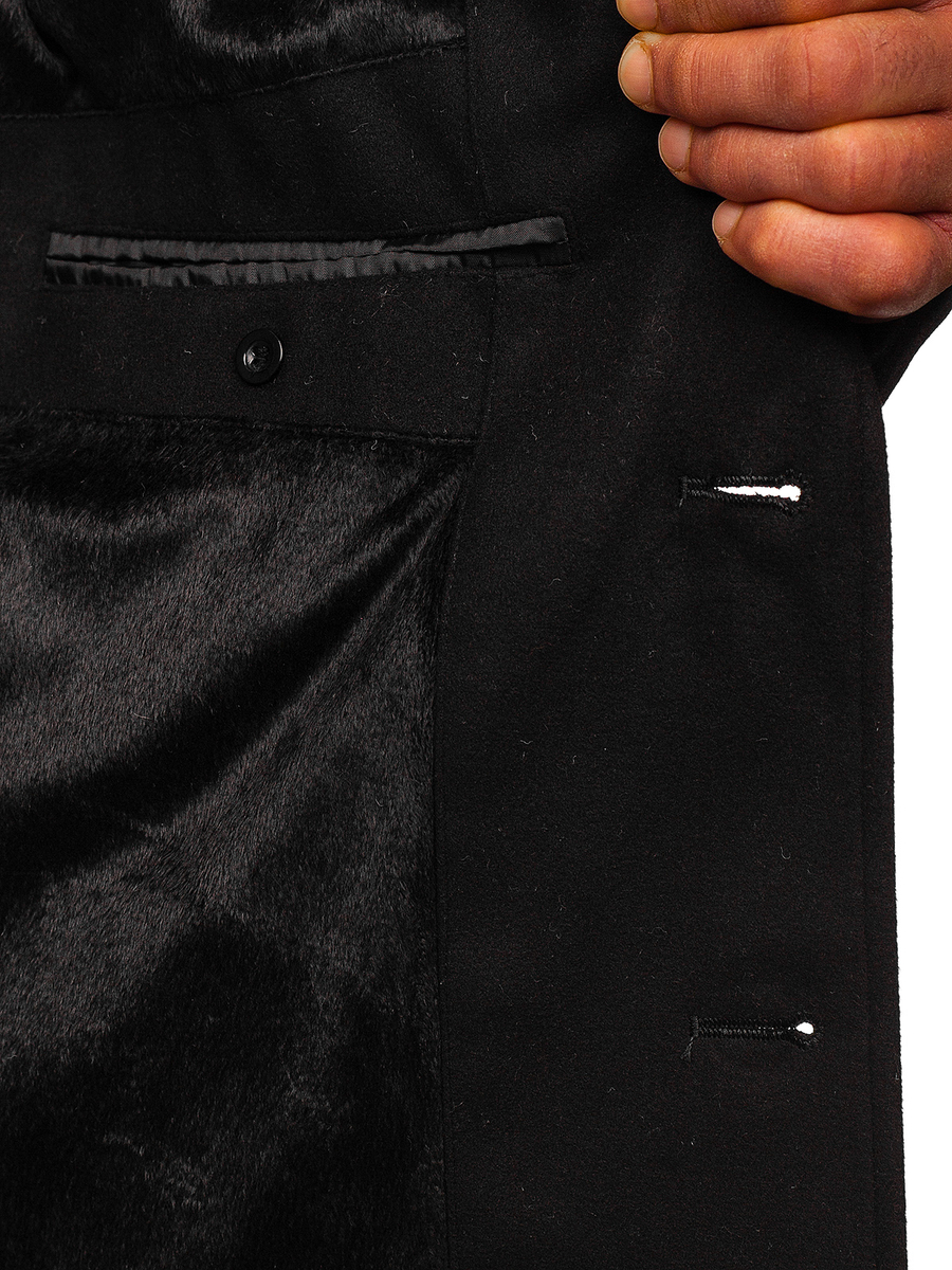Мъжко зимно палто в черен цвят Bolf 1047C то едноредно палто тип Честърфийлд. Идеален за студените зимни дни, тъй като има топла кожена облицовка и е изработена от плътна тъкан. Палтото е на копчета, има класическа яка. Палтото има два външни джоба с клапани и два вътрешни. Характер му дават декоративни бутони в краищата на ръкавите и стилен разрез.