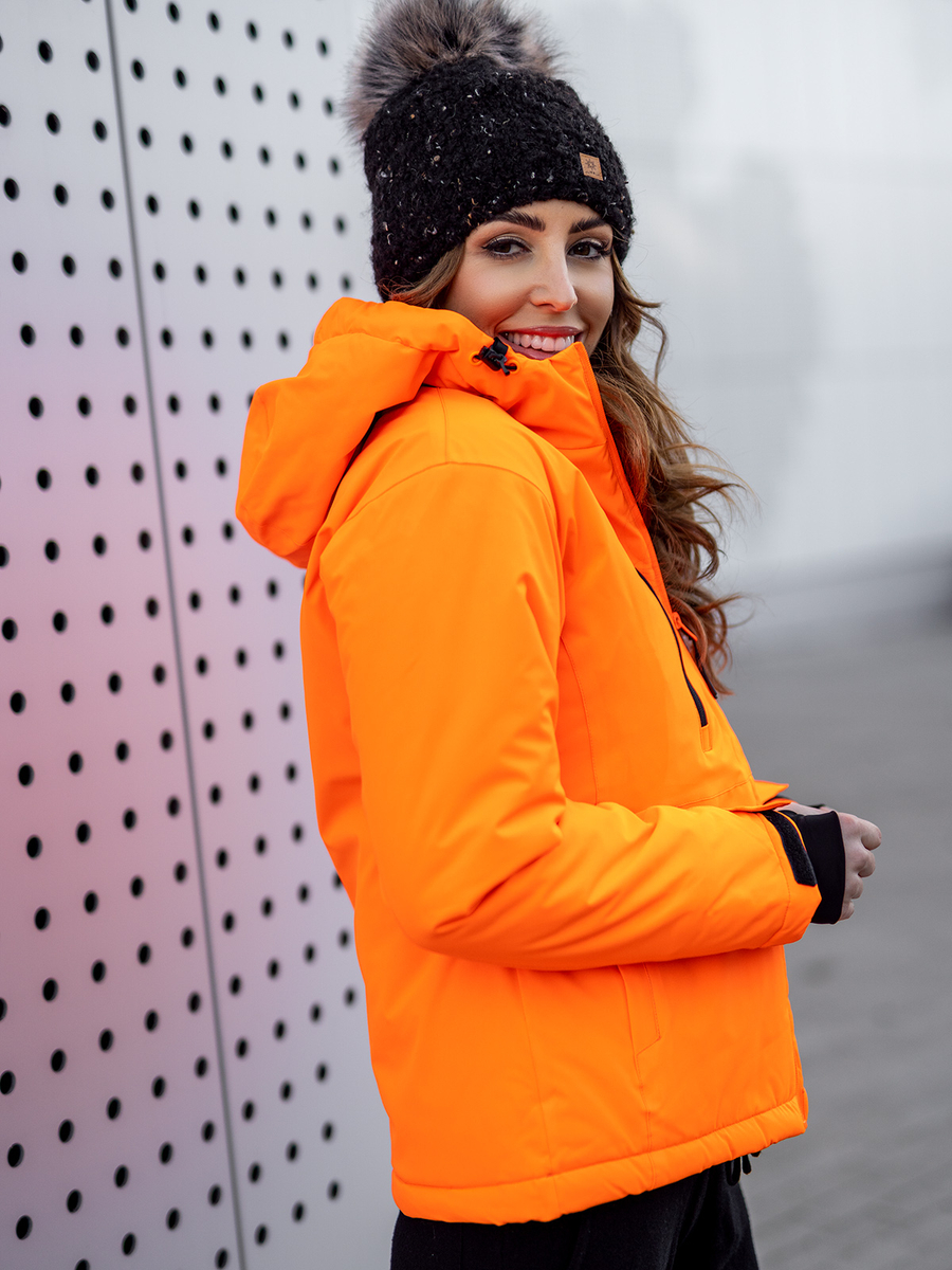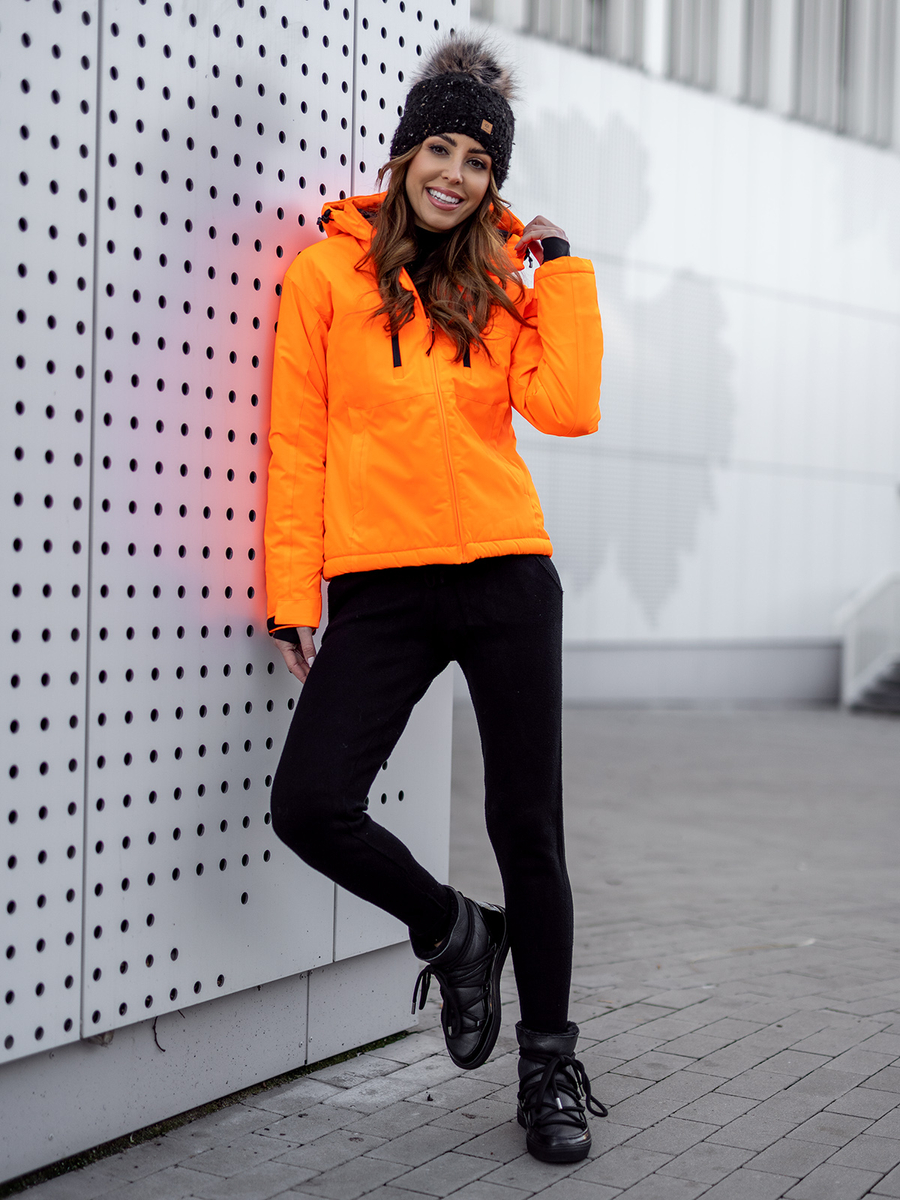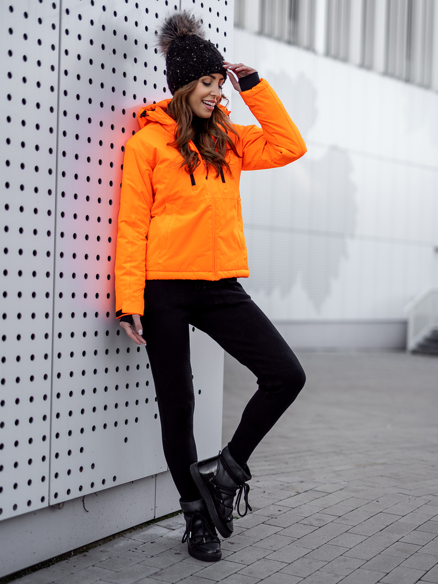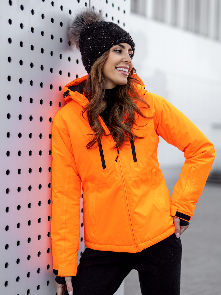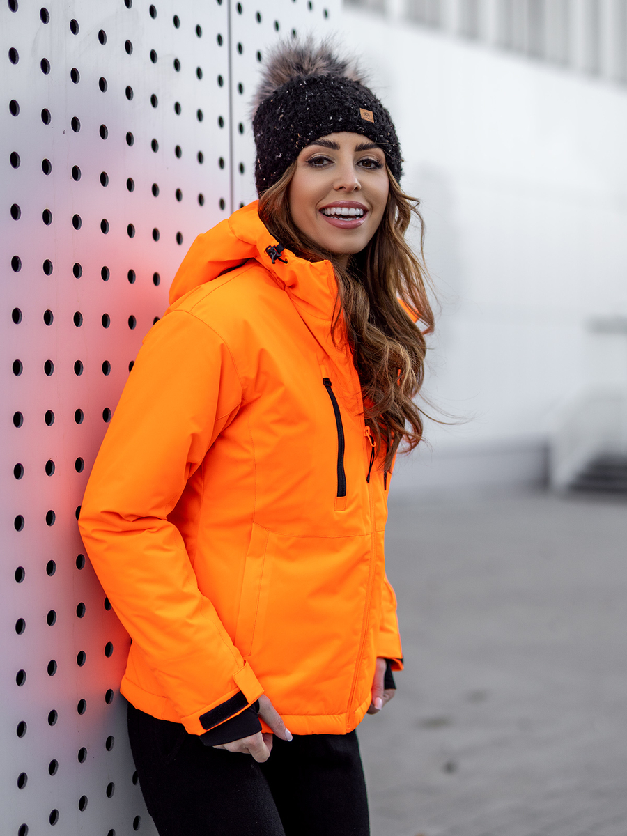 Дамското оранжево зимно ски яке Bolf HH012 е топло зимно яке в спортен контекст. То е топло и практично, а също много ефектно и в страхотни цветове. Със сигурност ще се хареса на жените, които следват модните тенденции. Закопчава се с цип. Има неподвижна, регулируема качулка. Якето е изчистено, изработено от плътна материя, която топли. Има висока яка, която допълнително ще предпазва от проникващ студ и вятър. Якето има два странични джоба с копчета, два джоба на гърдите с цип и един допълнителен джоб с цип на левия ръкав. В допълнение, има и един практичен вътрешен джоб с цип, в който можете да носите мобилен телефон или портфейл. Регулируеми ръкави с велкро ленти, отвътре са завършени с щрик. Якето е с пълнеж от синтетичен пух, благодарение на което ще ви послужи добре и в най-студените дни.