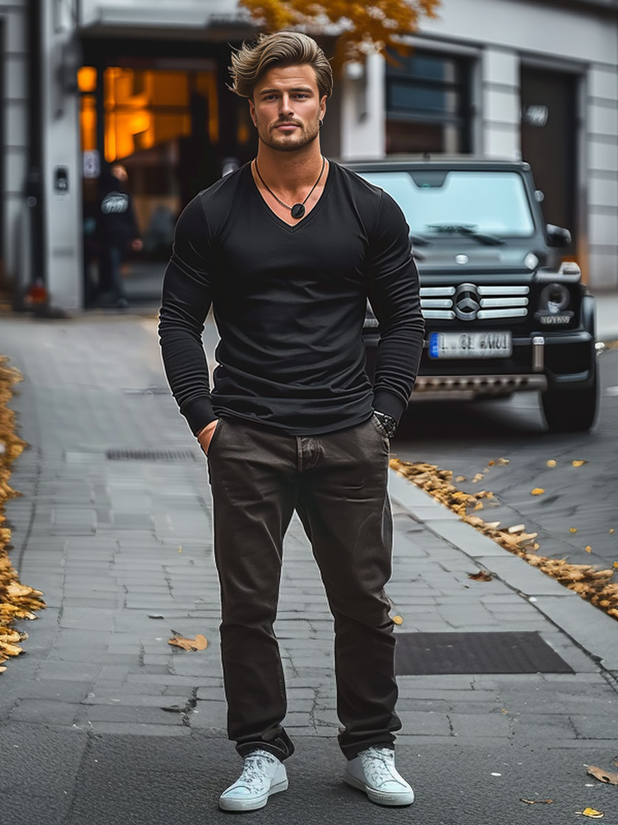 Модна, черна тениска с дълъг ръкав basic от Bolf. Страхотнa за тренировка, подходящa за неофициален стайлинг с дънки или чино панталони. Може да се носи също и под тънък суитшърт. Черният мъжки longsleeve стои добре, удобен е и ще добави модерна непринуденост към вашите тоалети.