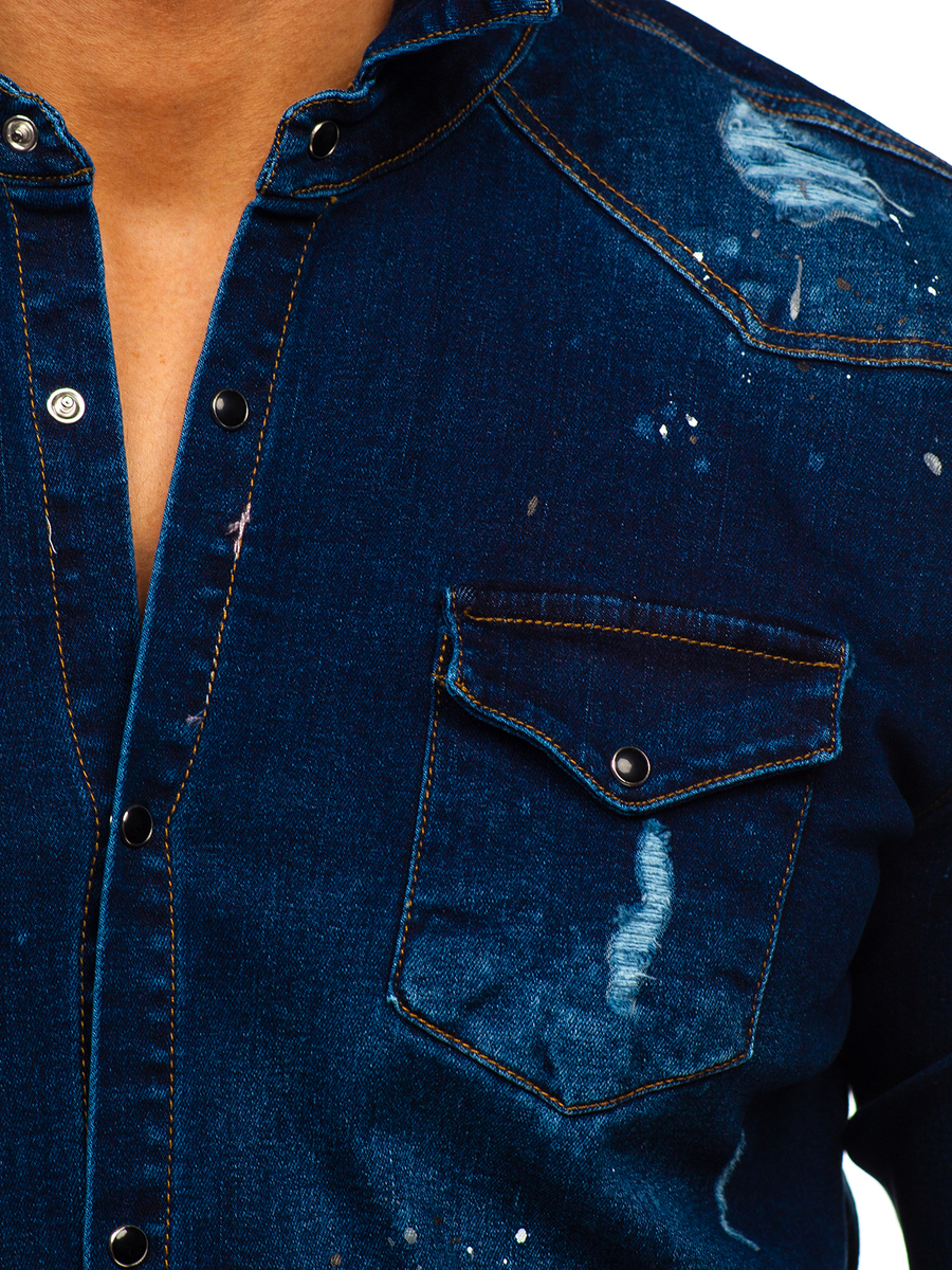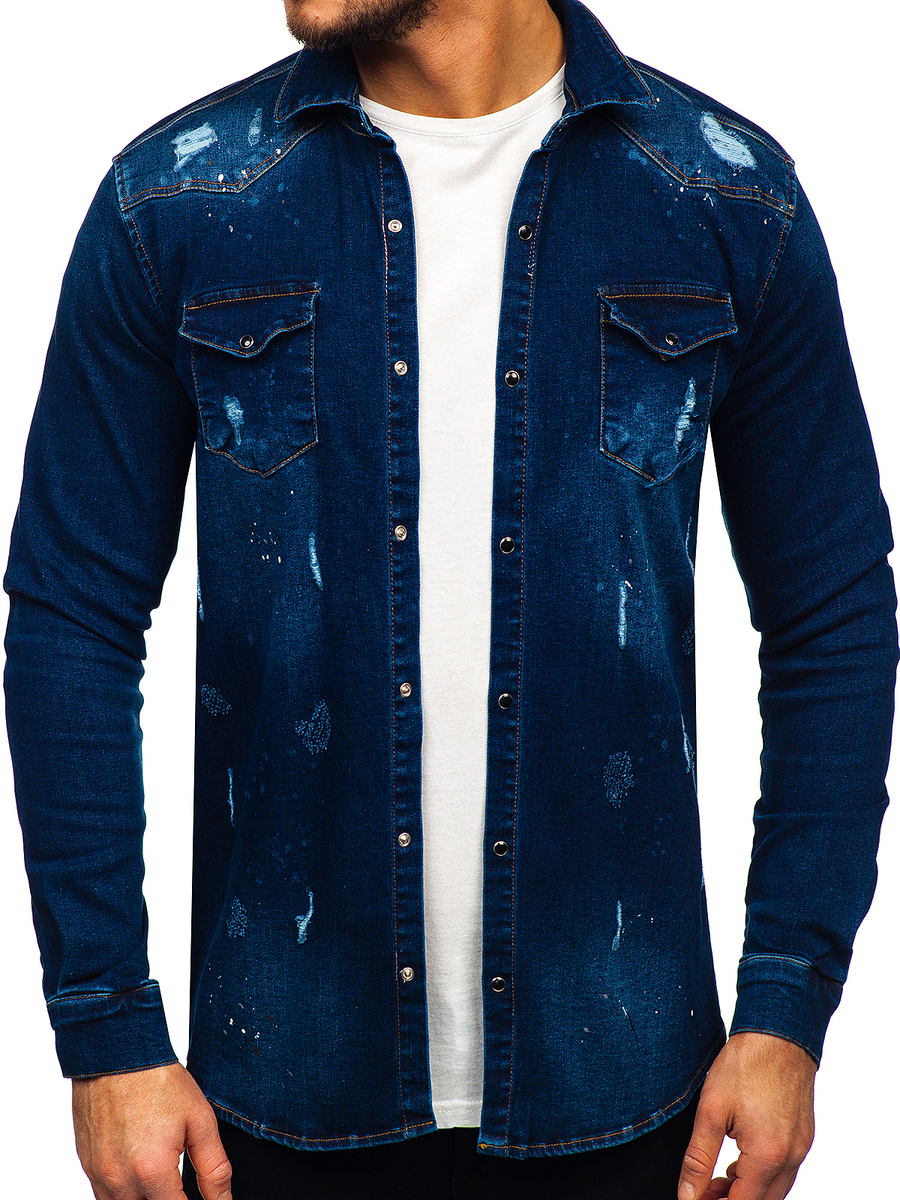 Отзиви и мнения на потребители за Тъмносиня мъжка дънкова риза с дълъг ръкав Bolf R801