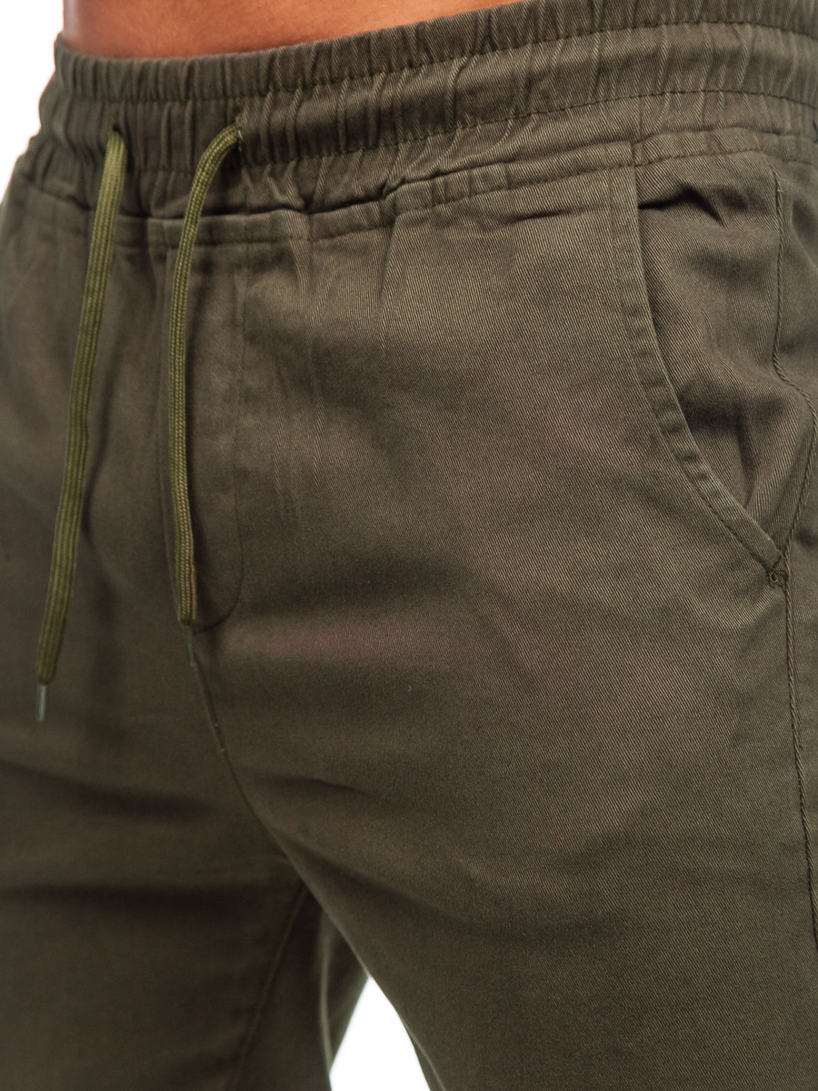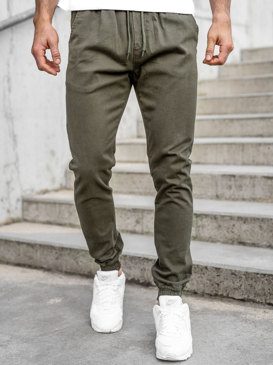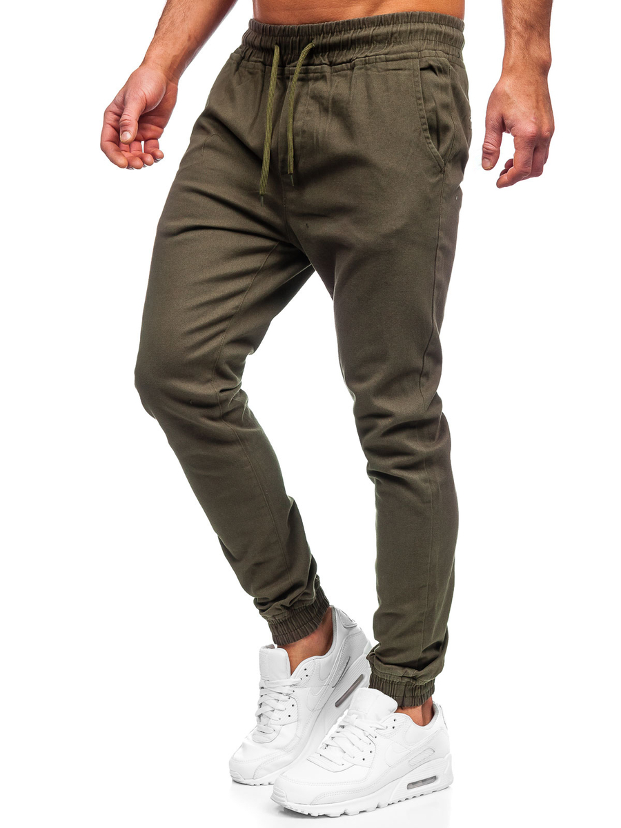 Каки мъжки панталони типа джогър Bolf 707 идеални за разходка, пътуване до града или среща с приятели. Джогърите са много популярни в мъжката мода през последните няколко години, в момента това трябва да има в гардероба на всеки любител на street стил Благодарение на регулирането на талията със силен шев и шнур, джогингът ще пасне на всяка фигура. Практичен елемент са два джоба отпред и два джоба с копче отзад. Крачолите са завършени с щрик. Изработени от 100% памук. Чудесно се съчетават със суитшърт, тениска или тениска с дълъг ръкав.