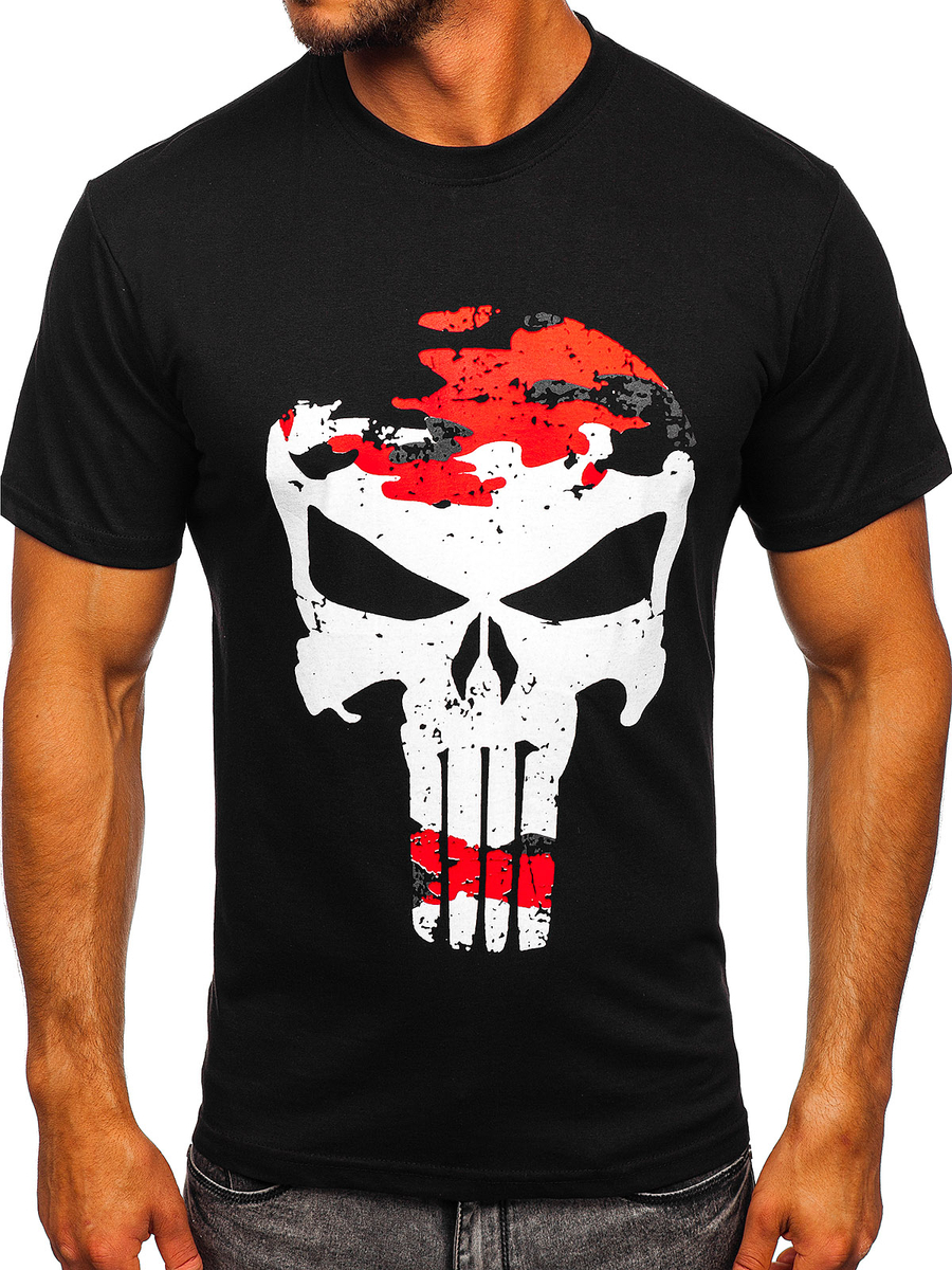 Мъжка тениска с принт Bolf 2098 в черно-червен цвят има голям принт. Има класически кръгъл деколт. Задната част на тениската е едноцветна цялата черна.