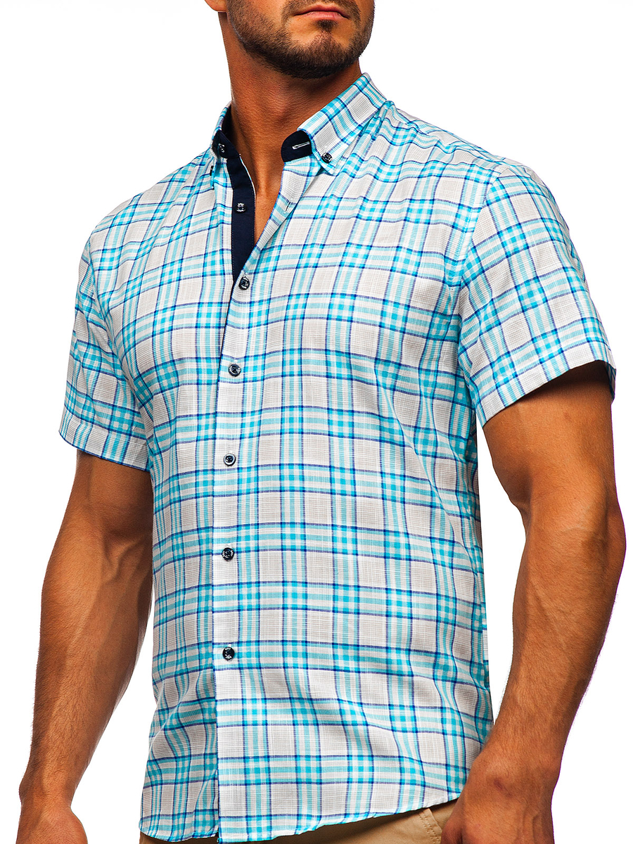 Небесносиня мъжка карирана риза с къс ръкав Bolf 201501