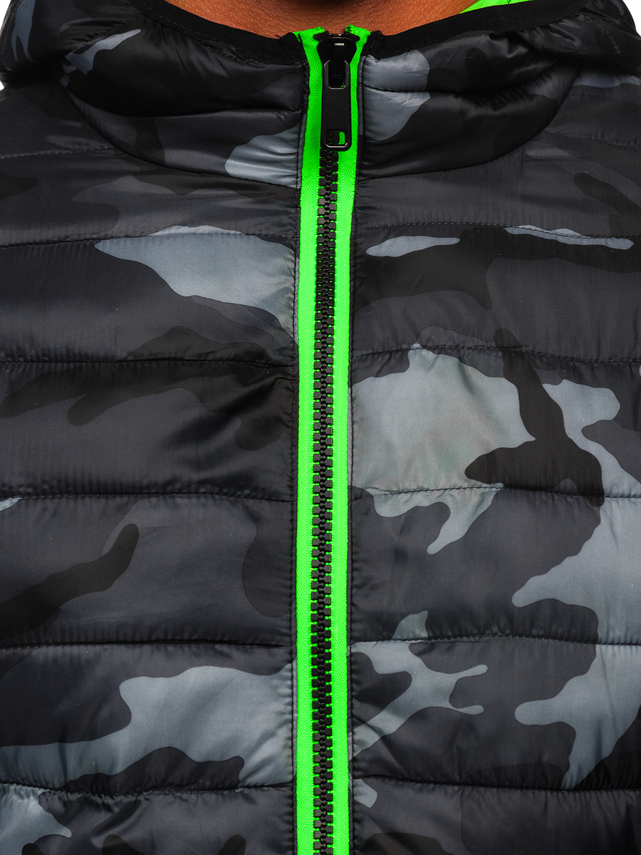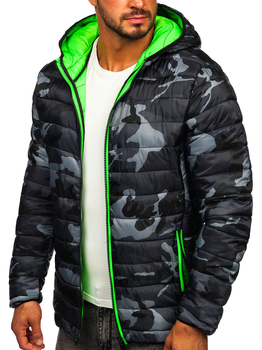 Черно-зеленото мъжко камуфлажно зимно спортно яке Bolf SM83 е идеално за есенния и зимния сезон. Този модел е с цип и има яка, свързана с регулируема качулка. Якето в черно и зелено е допълнено от изключително модерен камуфлажен десен. Капитонирането по цялата повърхност му придава унукален, спортен характер. Има два практични външни джоба с цип. Долната част и ръкавите са завършени с еластична веревна лента, което го прави стилно. Изработено от 100% полиестер. Междусезонното яке е предназначено за любителите на спортния стил. Перфектно за тренировка, дълга есенно-зимна разходка или излет в планината. Ще бъде идеално допълнение към спортно долнище, дънки и тениска.