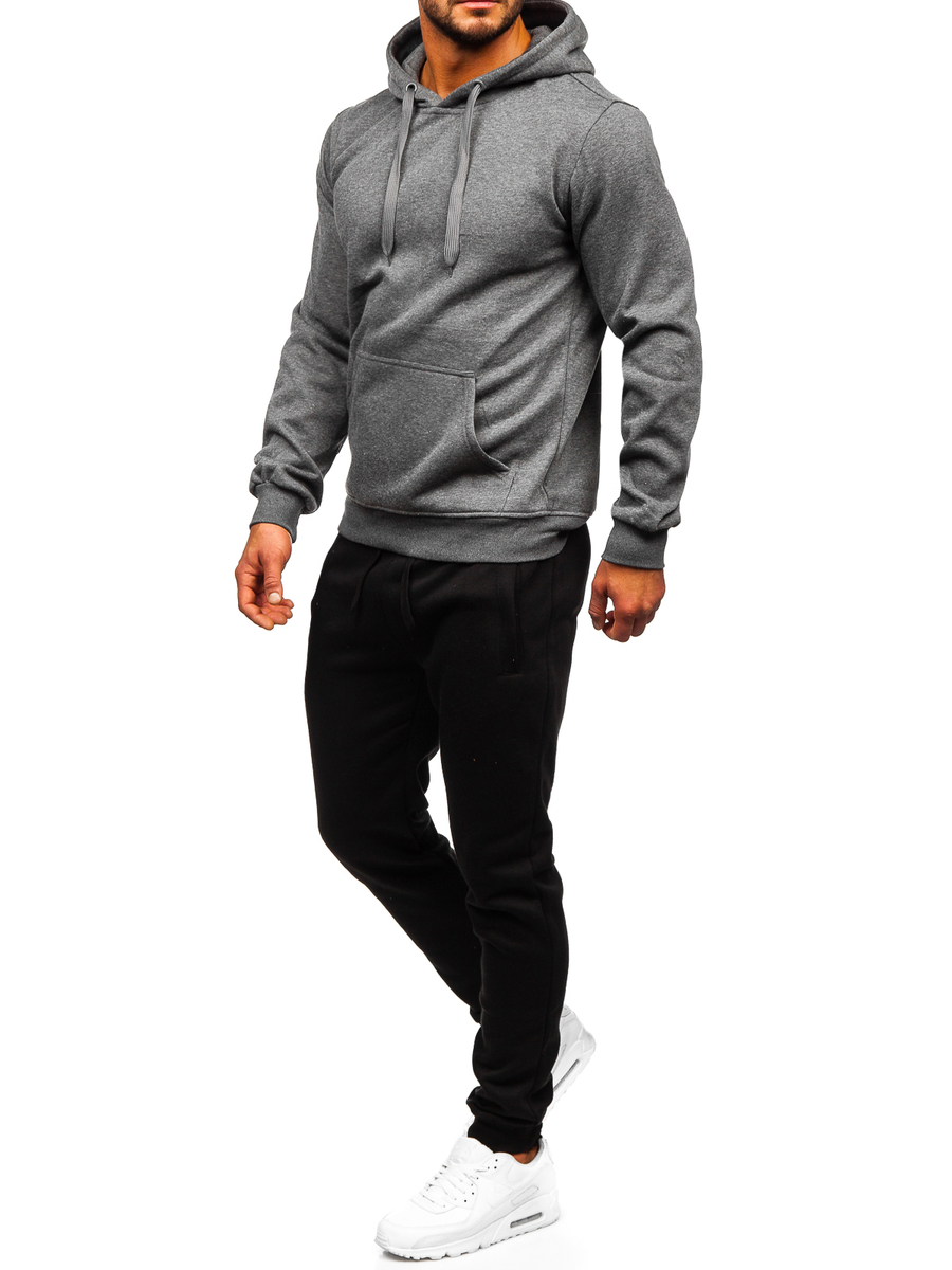Мъжкият анцуг в цвят антрацит с качулка Bolf D002 е спортен комплект, който е идеален както за дейности на открито, така и за фитнес. Комплектът включва суичър и долнище. Суичърът е с класически джоб тип кенгуру. Долнището е регулируемо в кръста чрез силен широк ластик и връзки и има два джоба отстрани. Спортен характер му придава простият фасон. Продуктът е изработен от мека, приятна на допир материя. Комплектът може да бъде универсална основа за изграждане на ежедневни или спортни тоалети. И суичърът, и долнището могат да се комбинират с други дрехи, като по този начин се получават много възможности за създаване на ежедневен стайлинг. Комплектът ще пасва идеално на тениска с леко преходно яке или спортно яке . Може да се носи за всеки ден в къщи, на разходка, пазаруване, както и за спортуване на открито или във фитнес зала.