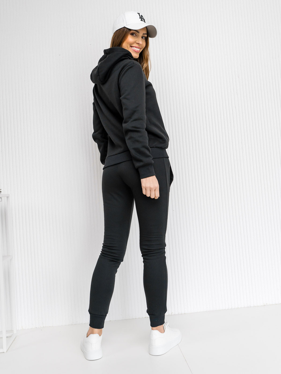 Дамският черен комплект Bolf 20382 е анцуг с класическа кройка, който идеално подчертава женската фигура. Състои се от суитшърт и долнище. Ръкавите и дъното са завършени с еластична веревна лента.<br0/> Горнището има регулируема качулка и джоб тип кенгуру. Долнището се регулира в кръста чрез силен, широк ластик и връзки. Практичен елемент са двата външни джоба. Продуктът е изработен от мека, приятна на допир материя. Спортен характер му придава опростената, вталена кройка. Може да бъде универсална основа за изграждане на ежедневни или спортни тоалети. Суичърът и панталоните могат да се комбинират с други дрехи, като по този начин се получават много възможности за създаване на ежедневни стилизации. Чудесно се комбинира сгорнище с цип и T-shirt.