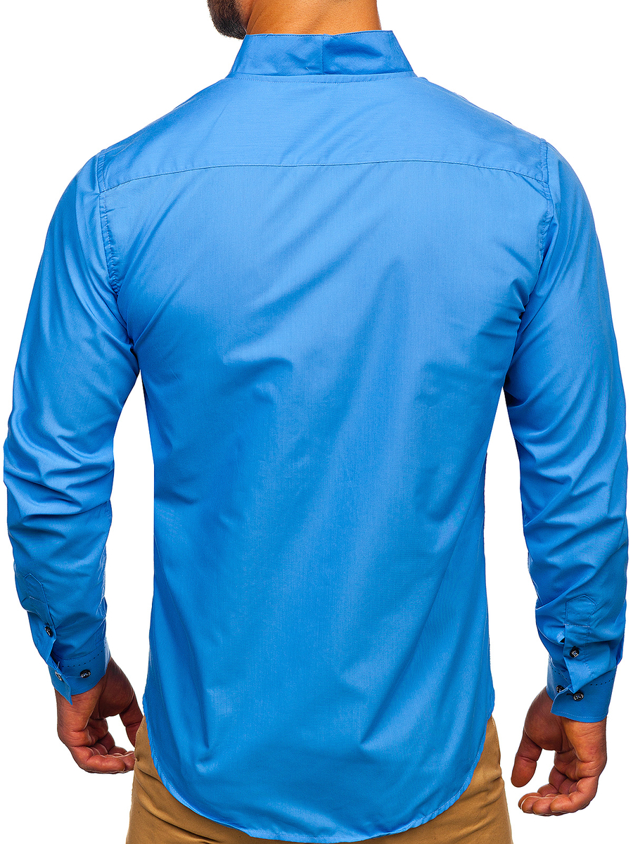 Светлосините мъжки ризи модел slim fit Bolf са предложение за смелите. Вместо традиционната яка, те имат висока яка. Лентата с копчета е фино маркирана. Светлосините ризи с дълги ръкави ви правят да изглеждате по-стройни. Изглежда добре в редица стилизации.