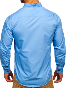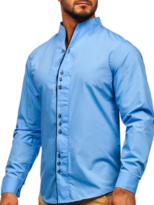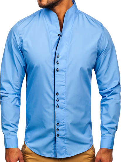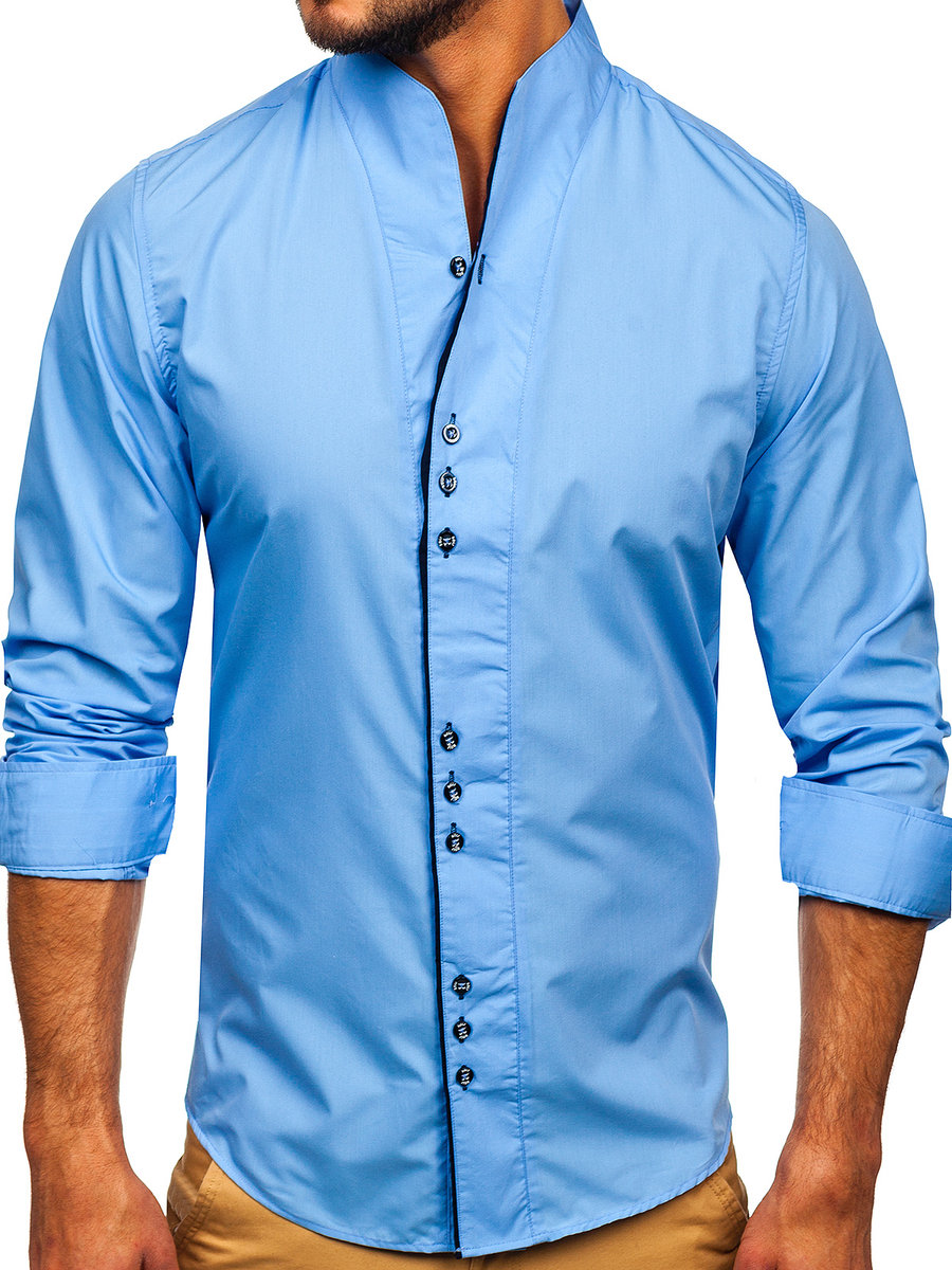 Светлосините мъжки ризи модел slim fit Bolf са предложение за смелите. Вместо традиционната яка, те имат висока яка. Лентата с копчета е фино маркирана. Светлосините ризи с дълги ръкави ви правят да изглеждате по-стройни. Изглежда добре в редица стилизации.