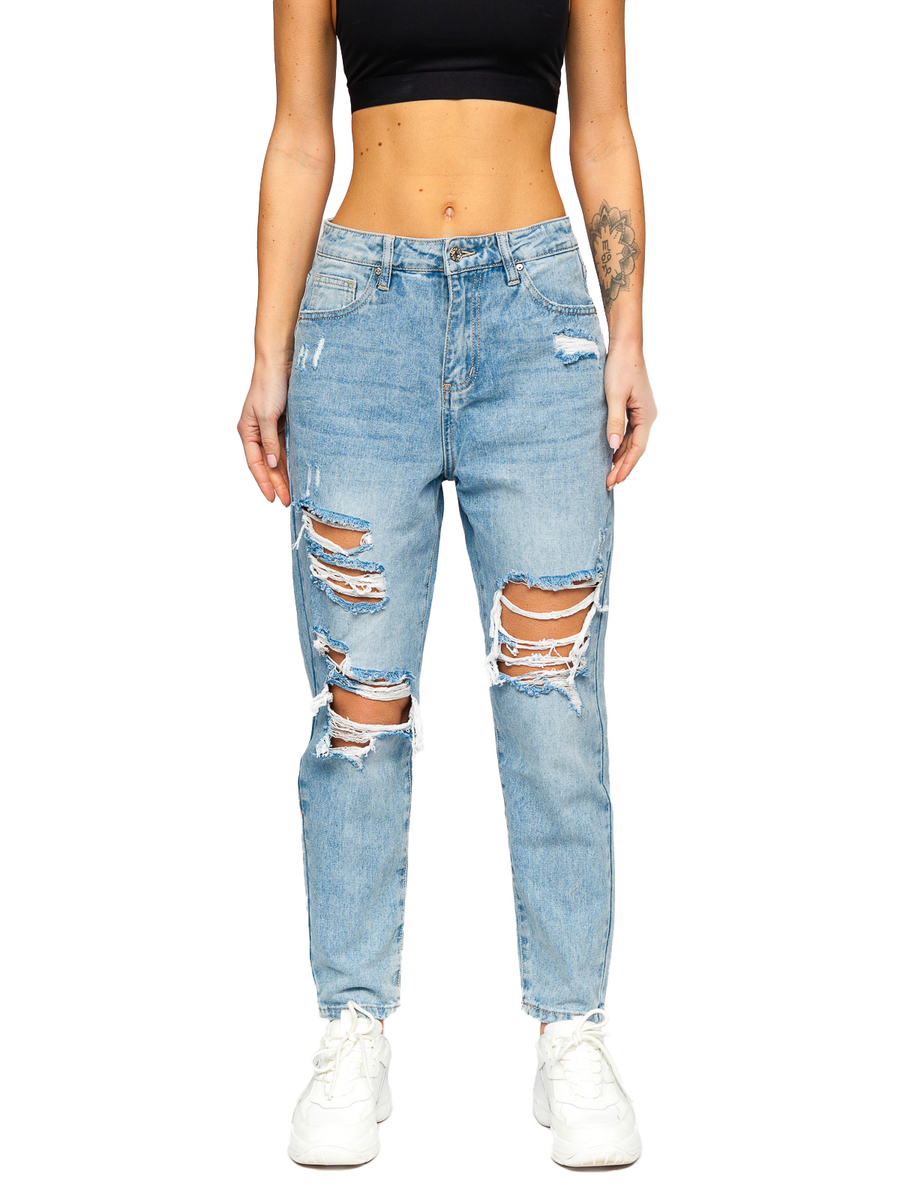 Сините дамски дънки mom fit Bolf WL2101 перфектно подчертават женската фигура. Уникален вид им придават модните протърквания и избелял ефект на крачолите. Изработени са от 98% памук и 2% вискоза, което ги прави изключително удобни.Панталоните от деним са универсална основа за изграждане на ежедневни стилизации. Можеш да ги облечеш на разходка, пазаруване или излизане с приятели. Чудесно се комбинират с тениска, кожено яке или суитшърт.