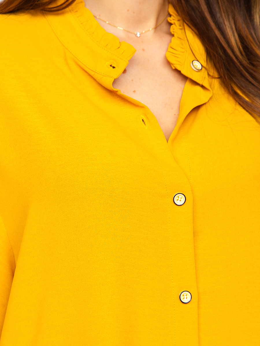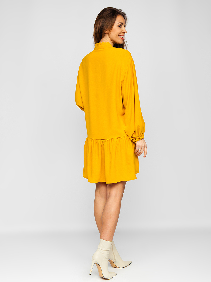 Дамската рокля Bolf XY202118 е комбинация от комфорт и стил. Нейните уникални детайли ѝ придават чар и характер, отличавайки я от другите рокли. Изработена от висококачествена материя, тя е удобна за носене и изглежда страхотно. Има декоративна висока яка и ръкави, завършени с ластик. Декоративното воланче отдолу ѝ придава нежност и деликатност. Роклята е идеална за срещи с приятели, за разходка или за ежедневен шопинг. Можеш да я комбинираш със сандали или сникърси, създавайки стилен ежедневен тоалет. Предлага се в много цветове.