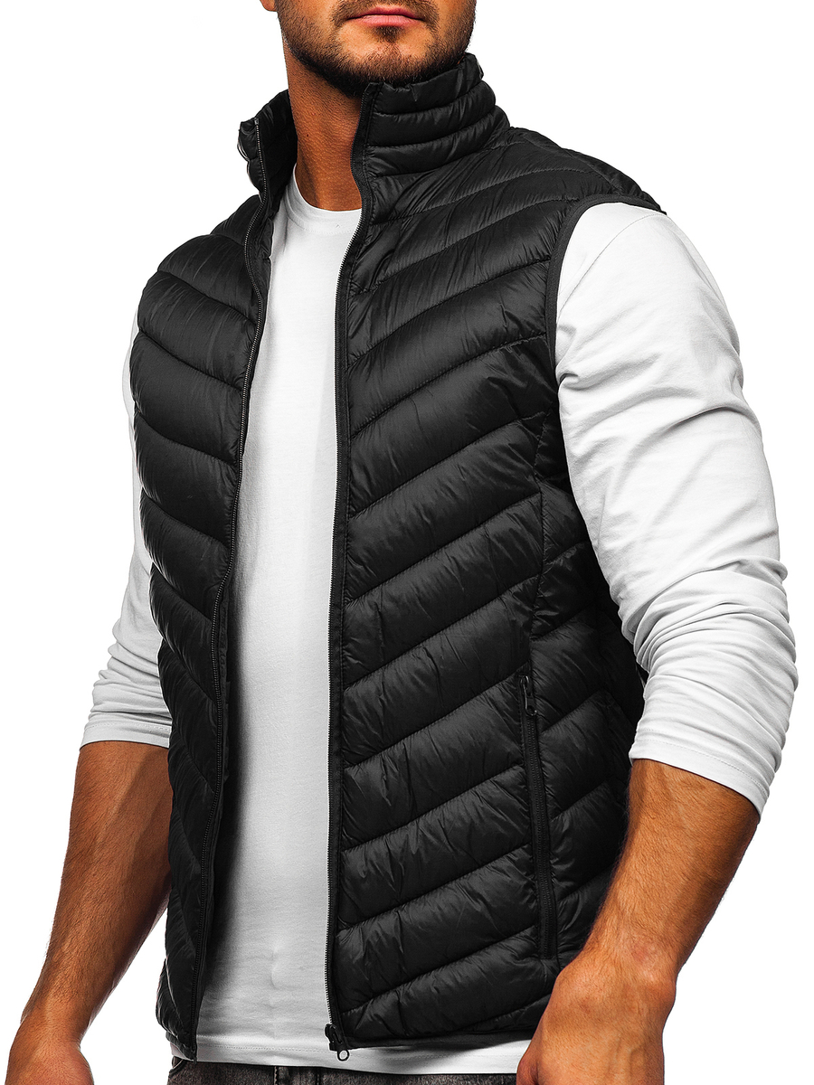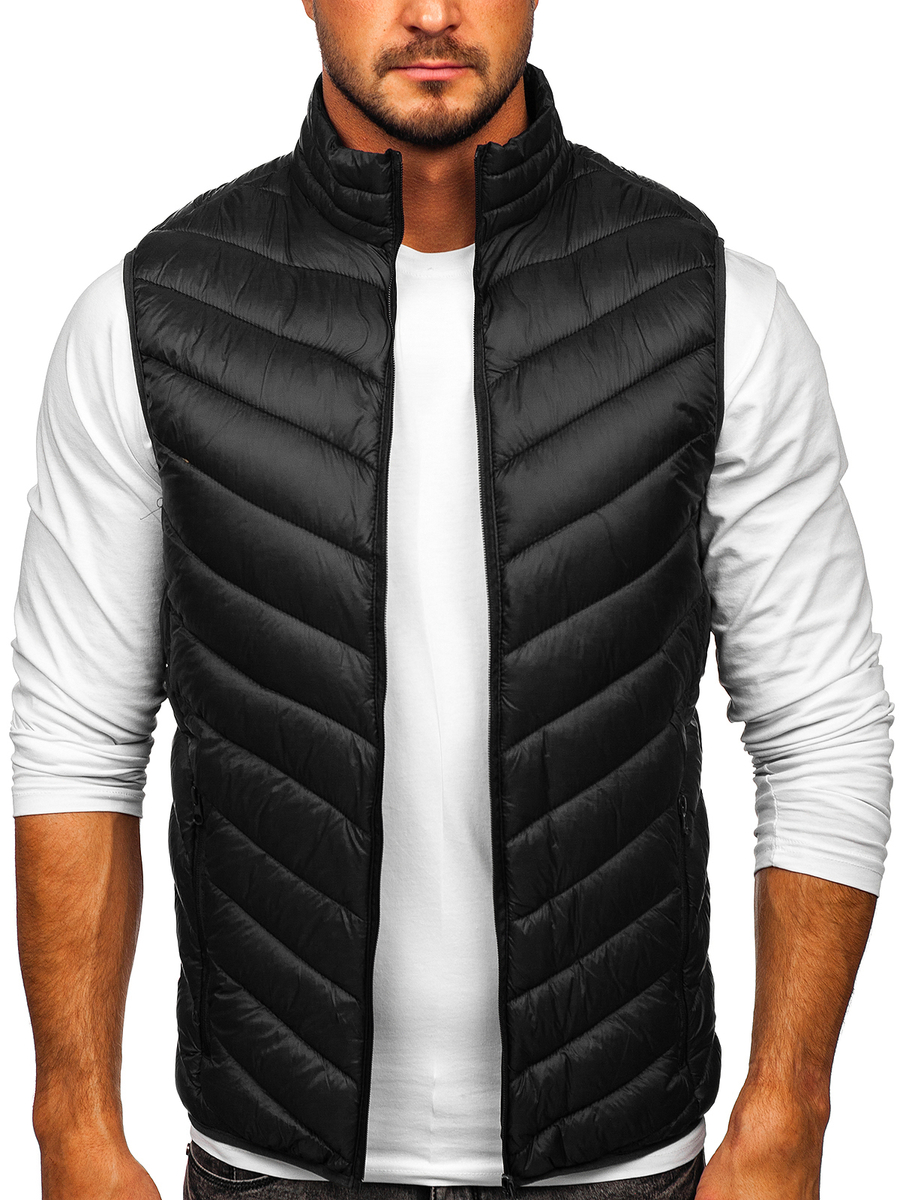 Черният капитониран мъжки елек Bolf 13073 е идеален за спортни аутфити. Този модел е с цип и има висока яка. Двата му външни джоба с ципове допринасят за практичността му. Изработен е от 100% найлон, а долната част и мишниците са завършени с еластична веревна лента. Капитонът на цялата повърхност допринася за спортния му характер. Този елек с класическа кройка ще бъде чудесна алтернатива на яке през есенния сезон, осигурявайки защита срещу студ и вятър. Ще изглежда страхотно с долнище и суичър , създавайки спортен, свободен outfit.