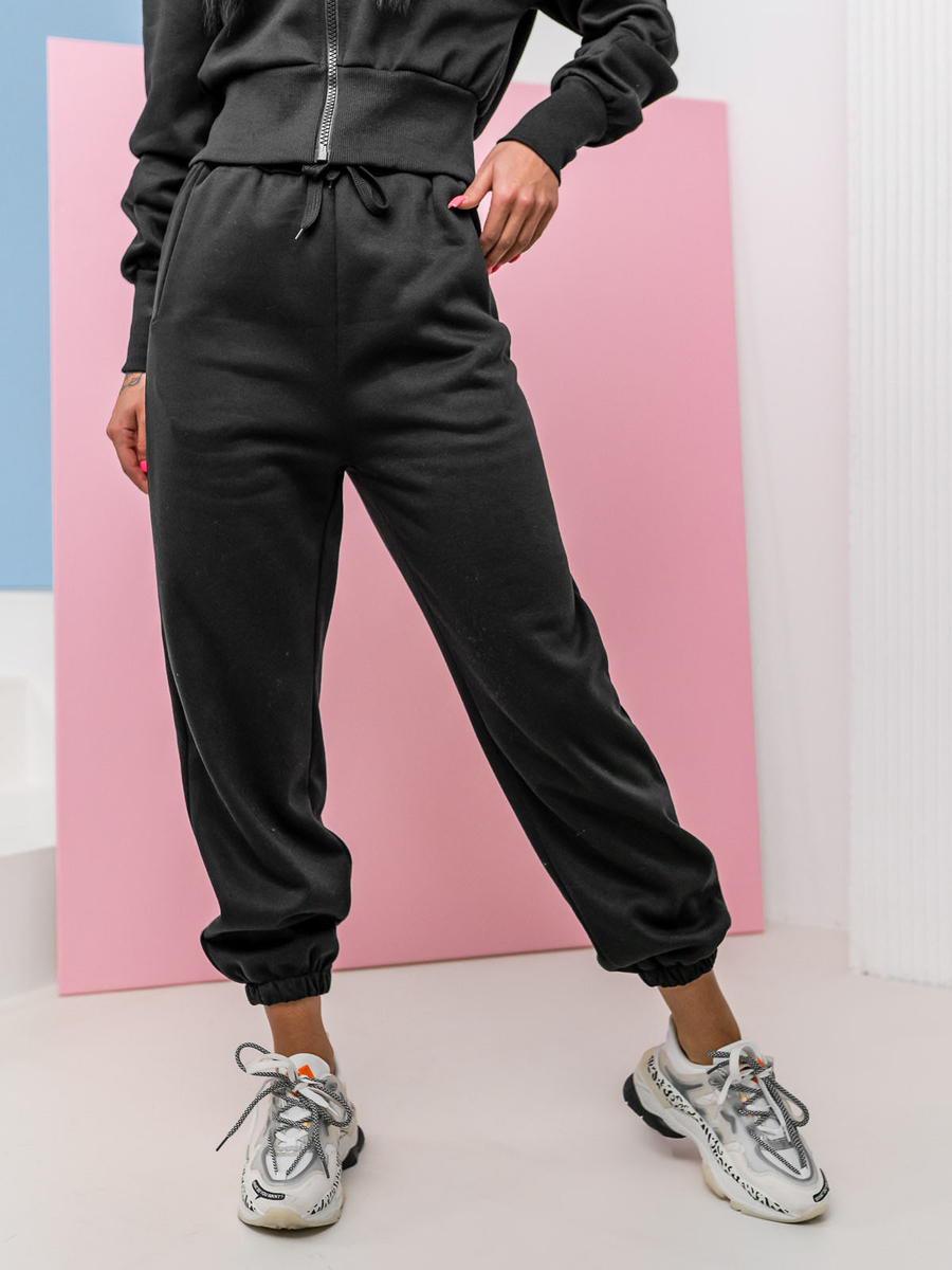 Дамският черен спортен комплект от две части Bolf 8C79 е хит в спортния стайлинг! Комплектът включва къс суитшърт с качулка и долнище. Долнището се регулира в кръста с широк ластик и връзки, има два външни джоба.Опростената, вталена кройка му придава спортен вид. Ръкавите, деколтето и долният подгъв са завършени с щрик. Продуктът е изработен от мека, приятна на допир материя. Може да бъде универсална основа за изграждане на ежедневни или спортни тоалети. Чудесно се комбинира с тениска или елек.