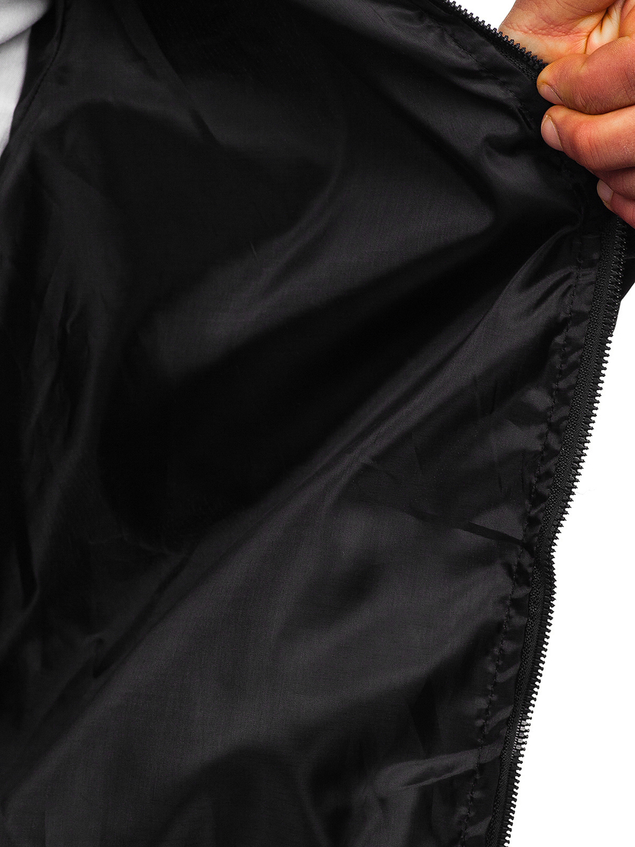 Мъжкото черно преходно бомбер яке 8M97 е класика през есента и пролетта. Закопчава се с цип. Има изправена яка с еластичен маншет, а също ръкавите и долната част са завършени с еластична маншет, благодарение на която якето приляга идеално към фигурата. Якето-бомбер има два външни джоба с ципове, където можете безопасно да приберете основните си неща. Универсалността на якето ви позволява да го използвате както в спортни, така и в ежедневни тоалети. Можете да получите спортен стил, като го комбинирате с тениска , суичър и джогъри . Ще изглежда също толкова добре в ежедневна версия с дънки и пуловер .