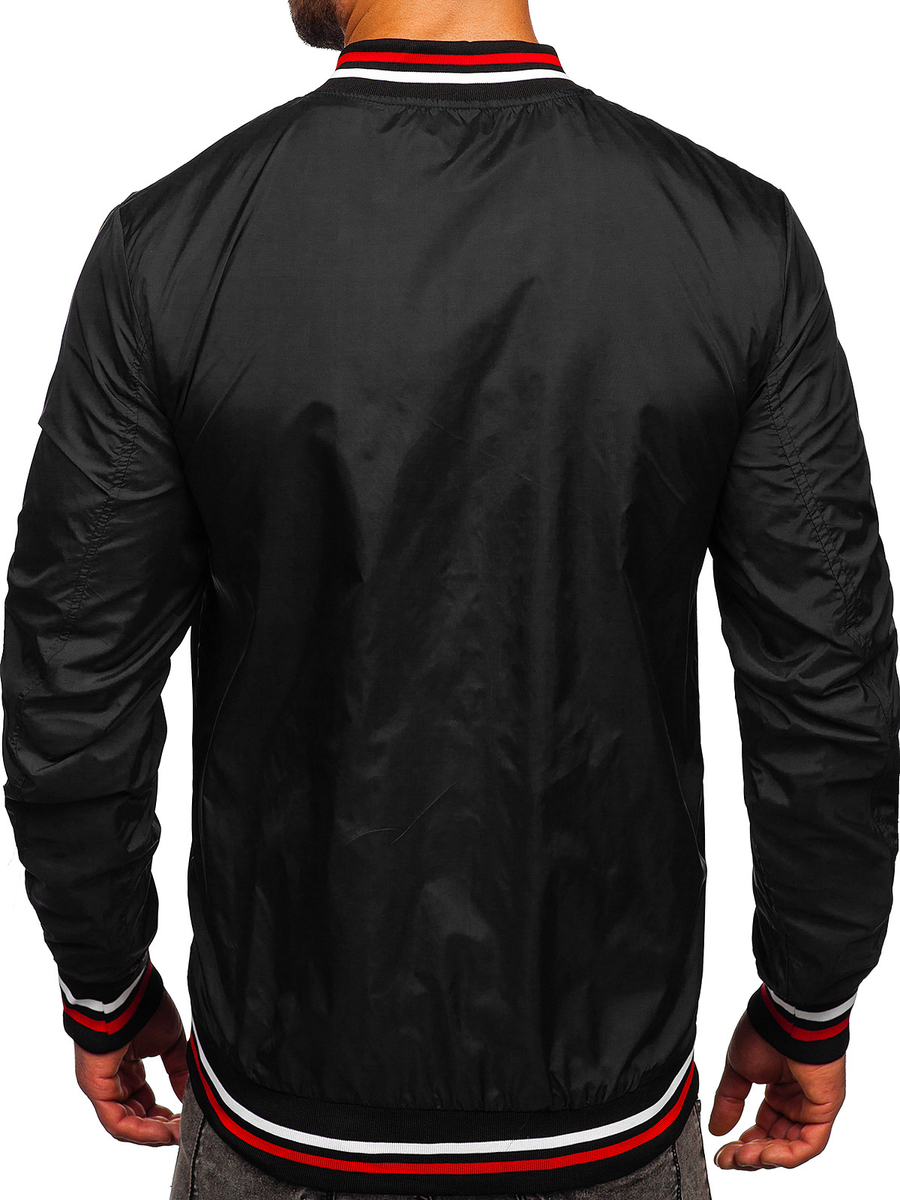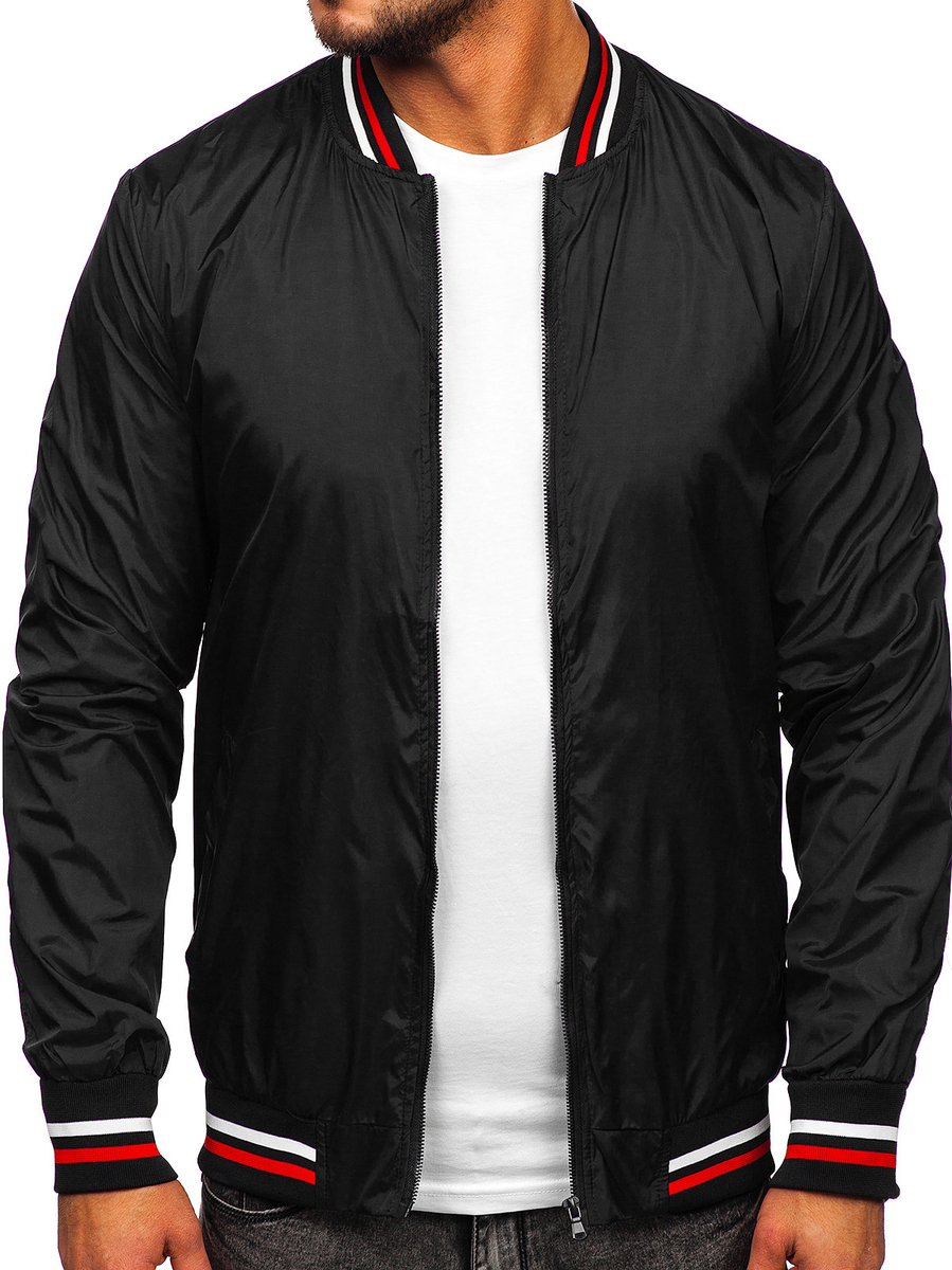 Черното мъжко преходно яке тип бомбър Bolf 8M96 е класика за есенно-пролетния сезон. Якето бомбър се закопчава с цип и има висока яка. Ръкавите и долната част са завършени с щрик, благодарение на който приляга идеално по фигурата и предпазва от студ. Якето бомбер има два външни джоба без закопчаване, в които спокойно можете да носите най-необходимите неща. Изключително удобното яке ще се докаже при създаването както на спортен, така и на ежедневен стайлинг. Създайте своята мечтана спортна визия със суичър и анцуг . Ще получите уникален стил, като комбинирате якето бомбър с дънки и пуловер .