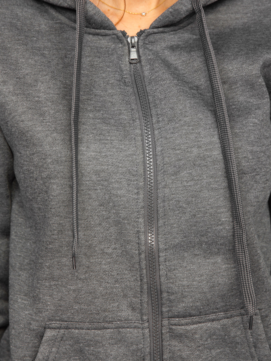 Дамският графитен комплект от две части Bolf 0003 е нашето уникално предложение за почитателите на спортната визия. Комплектът включва горнище и долнище. Суитшърт с цип, регулируема качулка и два джоба. Долнището се регулира в кръста с широк ластик и връзки. Има ва джоба отпред, а крачолите са завършени с еластичен маншет и осигуряват идеално напасване към фигурата. Спортен характер му придава опростената, вталена кройка. Продуктът е изработен от мека, приятна на допир материя. Самият анцуг създава идеално, спортно облекло, подходящо не само за тренировка, но и за свободен ден у дома или разходка в планината. Можете да го комбинирате с леко преходно яке, спортно яке или елек.