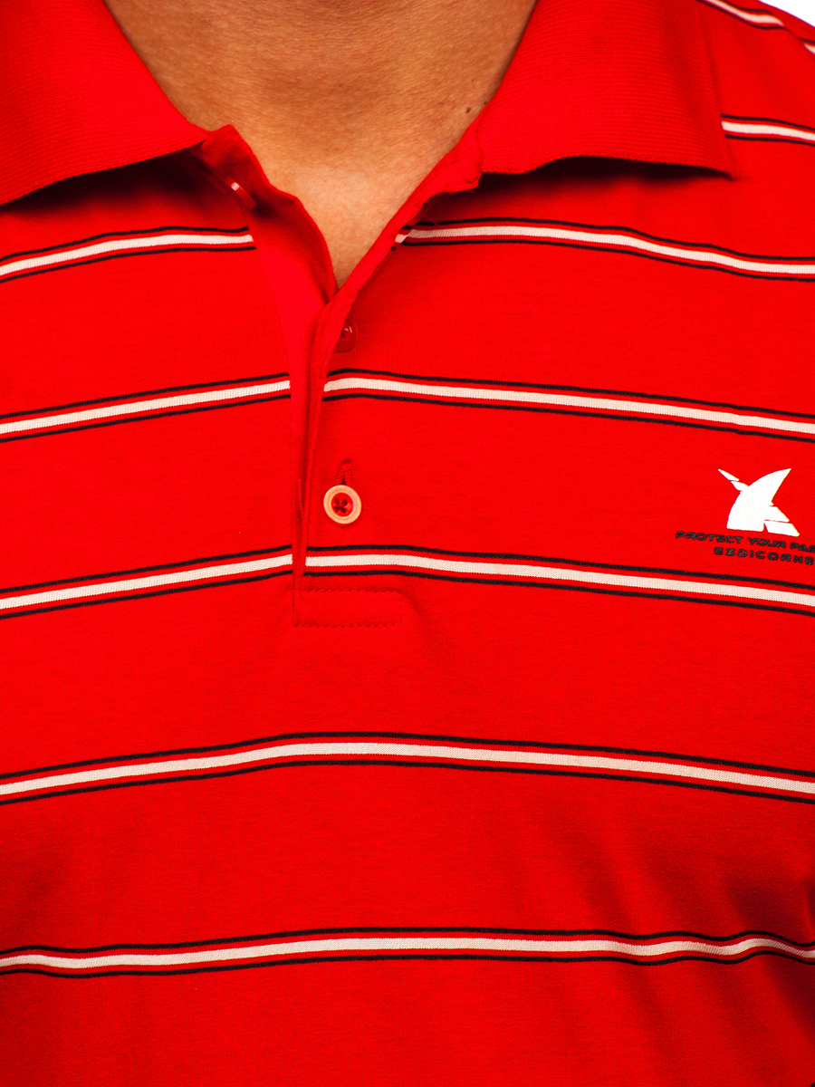 Червената мъжка тениска с щампа с Bolf 14954 се предлага в осем цветови варианта. Благодарение на богатата гама от цветове, винаги можете да съчетаете тениската с всеки стайлинг. Тениската с якичка е щампована изцяло с модерен десен на райета. Тениската с якичка е с права кройка и кръгло деколте, приляга на всяка фигура. Продуктът е изработен от 100% памук, което го прави приятен на допир и изключително удобен, независимо от обстоятелствата. Повод: среща с познати или разходка. Съчетай я с нашите чино панталони. Също така е идеална за по-свободен стайлинг с дънки и кожено яке.