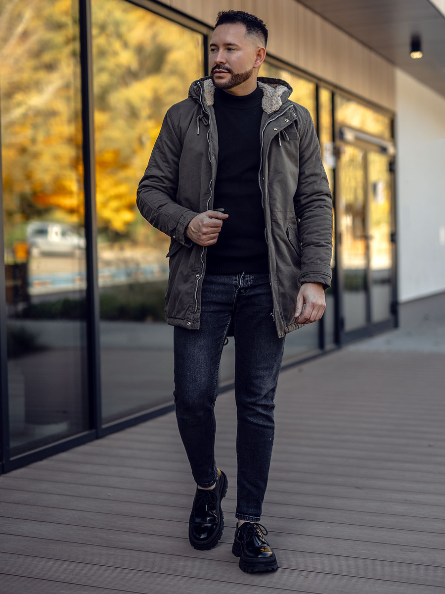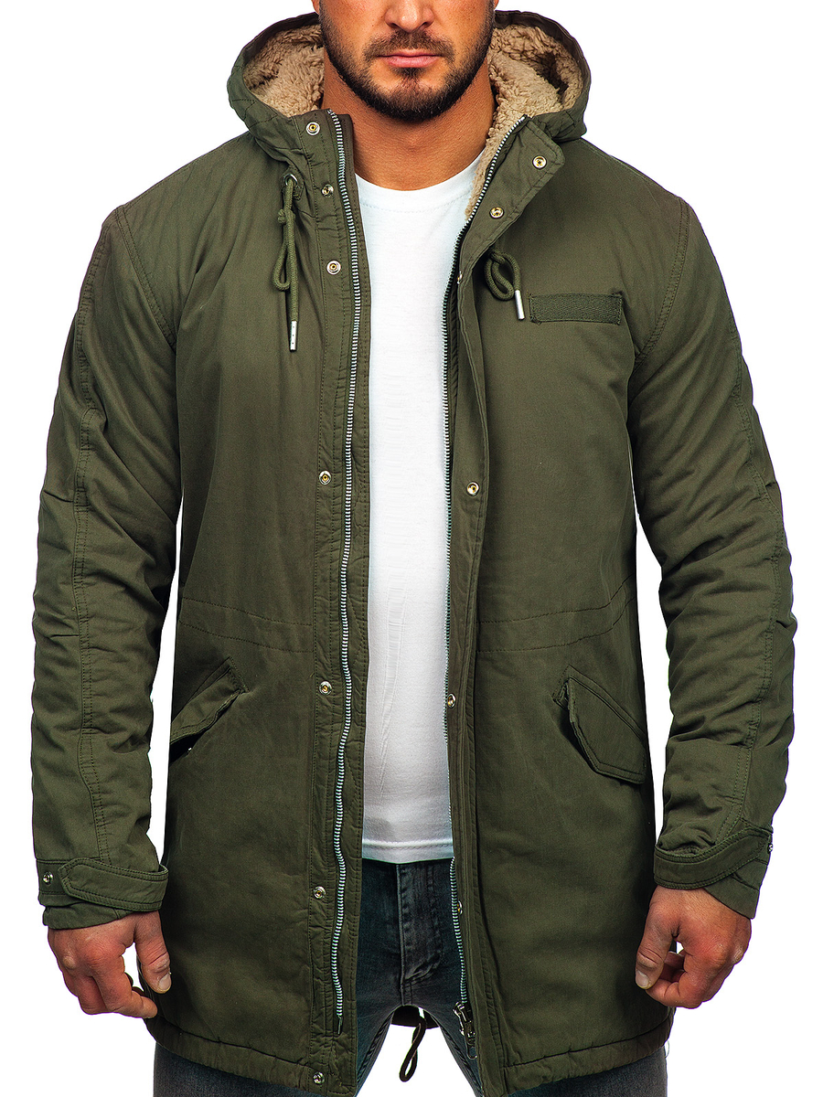 Зимното мъжко яке парка Bolf EX838 в цвят каки трябва да бъде във всеки мъжки гардероб по време на еснно-зимния сезон. Парката е впечатляваща и стои страхотно на мъжката фигура. Тя е не само модерна, но и невероятно практична и топла. Якето се закопчава с цип и тик-так копчета. Топла, регулируема качулка, свързана с яката. Качулката е обшита с топла подплата, която ще ви топли дори в най-студените дни. От вътрешната страна якето се регулира с шнур на талията, така че можете да го регулирате по ваш вкус, за да бъде повече или по-малко вталено. Два външни джоба, закопчаващи се с тик-так копчета. Ръкавите отвътре са завършени с щрик, а отвън се регулират с тик-так копчета. Гърбът на якето е удължен, което го прави по-комфортно дори в студените зимни дни.