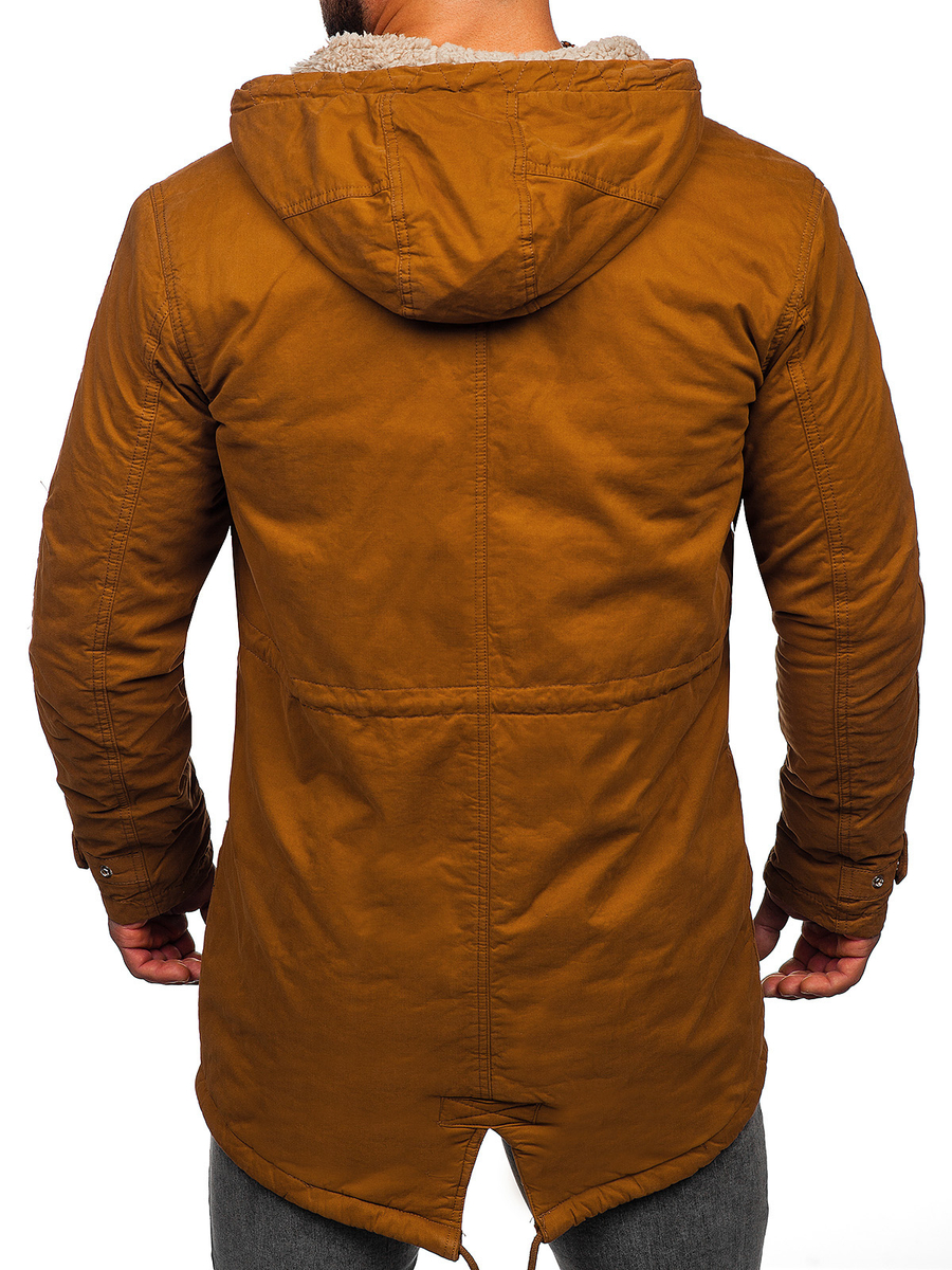 Зимното мъжко яке парка Bolf EX838 в цвят камел трябва да бъде във всеки мъжки гардероб по време на еснно-зимния сезон. Парката е впечатляваща и стои страхотно на мъжката фигура. Тя е не само модерна, но и невероятно практична и топла. Якето се закопчава с цип и тик-так копчета. Топла, регулируема качулка, свързана с яката. Качулката е обшита с топла подплата, която ще ви топли дори в най-студените дни. От вътрешната страна якето се регулира с шнур на талията, така че можете да го регулирате по ваш вкус, за да бъде повече или по-малко вталено. Два външни джоба, закопчаващи се с тик-так копчета. Ръкавите отвътре са завършени с щрик, а отвън се регулират с тик-так копчета. Гърбът на якето е удължен, което го прави по-комфортно дори в студените зимни дни.