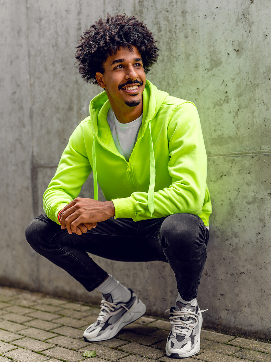 Светлозелен мъжки суитшърт с качулка и цип Bolf 2008А. Това е класически суитшърт, изработен от мек, приятен на допир трикотаж. Продуктът се характеризира с много ярки цветове, в които се предлага. Има регулируема качулка в плътен цвят и странични джоба. Долният подгъв и ръкавите са завършени с ластичен маншет Суитшърът силно се препоръчва за феновете на минимализма и комфорта в модата. Ефектен и удобен. Те са задължителен елемент във всеки мъжки гардероб. Простият класически стил в интересни цветове прави този модел суитшърти идеален завършек на много ежедневни и street стилизации. Елегантният мъжки суитшърт с цип е предложение, което си струва да имате в гардероба си не в един, а дори в няколко цветови варианта. От класическото черно през сини и зелени нюанси до малко по-екстравагантни оранжеви, жълти или розови разцветки. Практичен суитшърт по всяко време на годината.