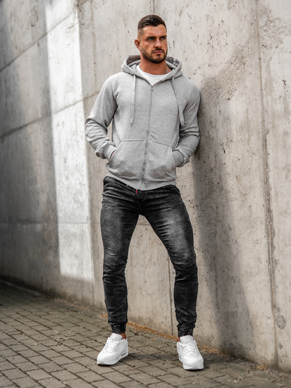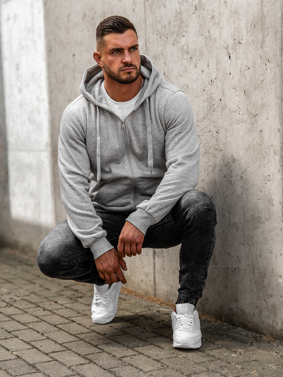 Сив мъжки суитшърт с качулка и цип Bolf 2008А. Това е класически суитшърт, изработен от мек, приятен на допир трикотаж. Продуктът се характеризира с много ярки цветове, в които се предлага. Има регулируема качулка в плътен цвят и странични джоба. Долният подгъв и ръкавите са завършени с ластичен маншет Суитшърът силно се препоръчва за феновете на минимализма и комфорта в модата. Ефектен и удобен. Те са задължителен елемент във всеки мъжки гардероб. Простият класически стил в интересни цветове прави този модел суитшърти идеален завършек на много ежедневни и street стилизации. Елегантният мъжки суитшърт с цип е предложение, което си струва да имате в гардероба си не в един, а дори в няколко цветови варианта. От класическото черно през сини и зелени нюанси до малко по-екстравагантни оранжеви, жълти или розови разцветки. Практичен суитшърт по всяко време на годината.