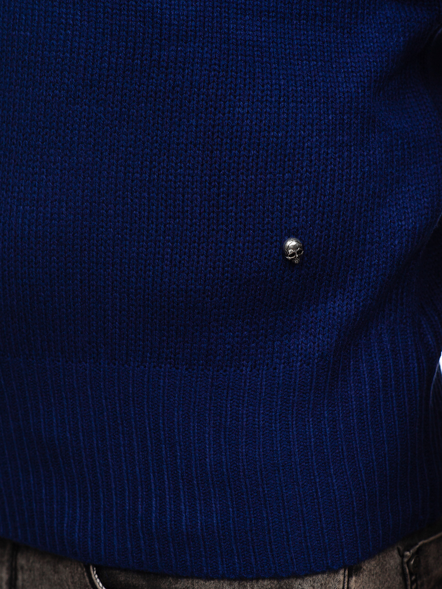 Тъмносиният мъжки пуловер Bolf MM6018 е отличен избор за създаване на модна визия в по-студените дни. Има висока яка, завършена с щрик. Долният подгъв и ръкавите са завършени с щрик, благодарение на което чудесно стои на фигурата, като остава изключително удобен. Продуктът е изработен от висококачествена материя. Предлага се в три цветови варианта. Модният орнамент в долната част добавя характер. Благодарение на приглушеният цвят, поуловерът се съчетава чудесно с по-светли и по-тъмни тоалети. Класическият пуловер чудесно се съчетава с панталони чино и кожено яке.