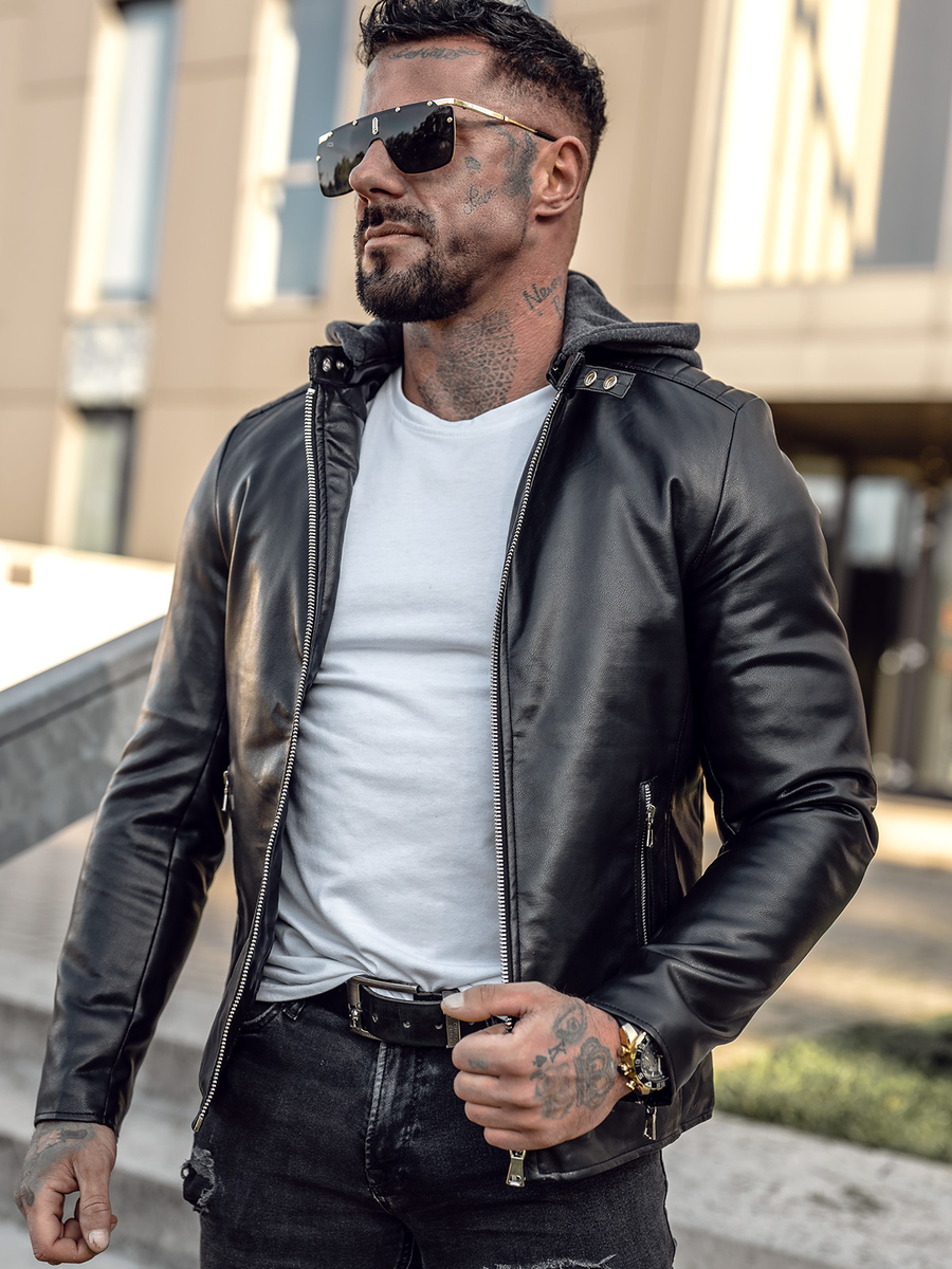 Черното мъжко кожено яке тип байкър 11Z8012 има класическа права кройка. Този модел се закопчава с цип и има копче тик-так на високата яка. Има практична, сваляща се качулка, имитираща суичър. Двата външни джоба с цип и вътрешният джоб му придават практичен характер. Декоративните и отличителни ципове на ръкавите му придават характер. Уникалното, ватирано кожено яке е с универсална, вечна кройка и е в ежедневен стил. Ще изглежда страхотно в комбинация с джогъри, дънки или в по-небрежен стил със спортно долнище.