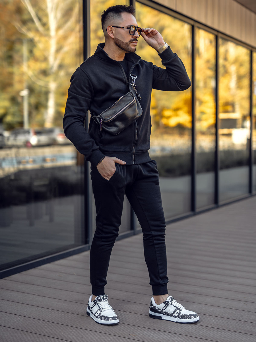 Мъжкият черен анцуг Bolf 10385е спортен комплект, който включва суичър и долнище. Суитшърт с цип и външни джобове. Долнището се регулира в кръста с широк ластик и връзки, има два външни джоба. Спортен характер му придава опростената, вталена кройка. Продуктът е изработен от мека, приятна на допир материя. Може да бъде универсална основа за изграждане на ежедневни или спортни тоалети. Суичърът и панталоните могат да се комбинират с други дрехи, като по този начин се получават много възможности за създаване на ежедневни стилизации. Чудесно се комбинира с тениска , с леко яке, преходно яке или спортно яке.