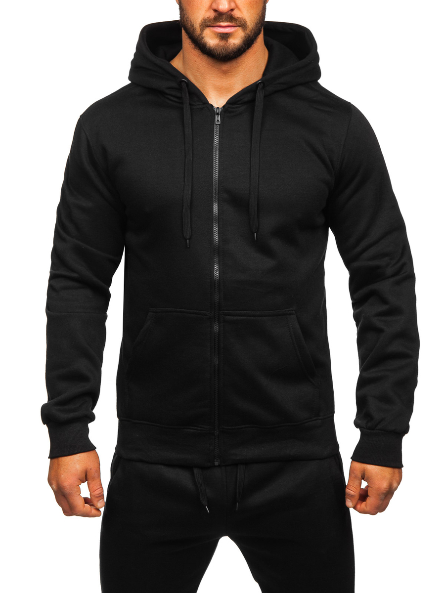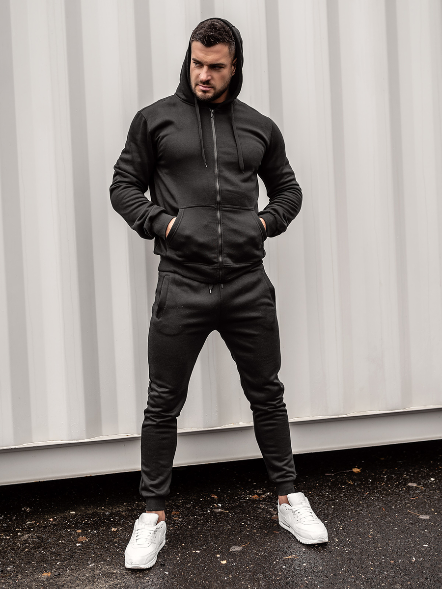 Мъжкият черен анцуг Bolf 10386е спортен комплект, който включва суичър и долнище. Суитшърт с цип и външни джобове. Долнището се регулира в кръста с широк ластик и връзки, има два външни джоба. Спортен характер му придава опростената, вталена кройка. Продуктът е изработен от мека, приятна на допир материя. Може да бъде универсална основа за изграждане на ежедневни или спортни тоалети. Суичърът и панталоните могат да се комбинират с други дрехи, като по този начин се получават много възможности за създаване на ежедневни стилизации. Чудесно се комбинира с тениска , с леко яке, преходно яке или спортно яке.
