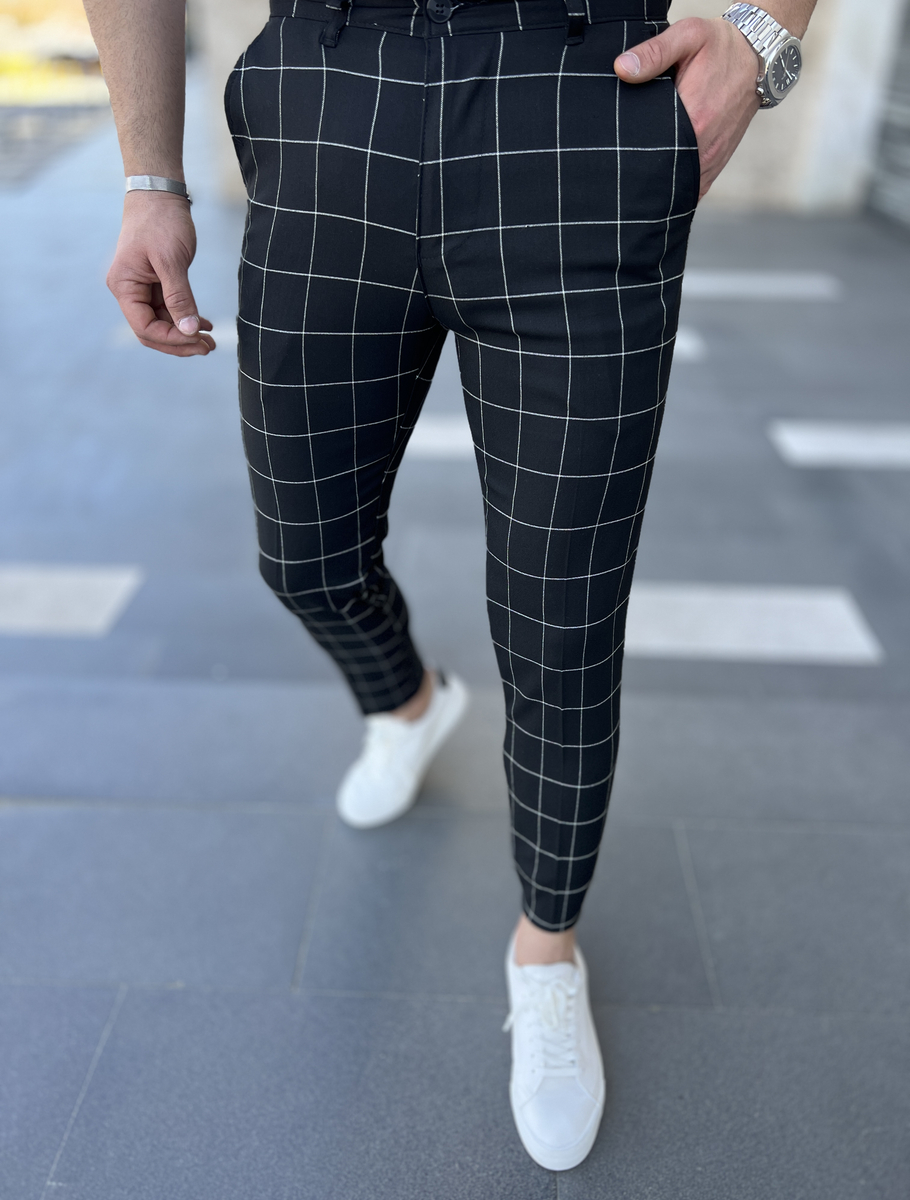 Мъжките карирани черни чино панталони Bolf 0040 са идеални за любителите на елегантната визия. Панталонът е с класически дълъг крачол и се закопчава с цип и копче. Този модел има практични джобове, в които ще събереш най-важните неща и документи. Два джоба отпред и два отзад Изработен е от висококачествена материя, което го прави изключително удобен и приятен на допир. Панталоните чино са с класическа кройка, удобни, практични и винаги изглеждат добре. Комбинирайте панталона с кожено яке и тениска, зa да получите визия, подходяща за почти всеки повод.