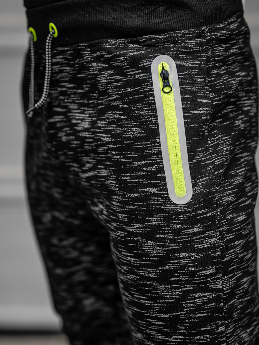 Мъжки черен спортен панталон Bolf с неравномерен принт. Стои идеално, има 2 джоба с цип и практичен колан, а също контрастни вложки на джобовете. Можеш да обличаш черният мъжки панталон в различни стилизации. Носи го с тениска, блуза с дълъг ръкав или суитшърт.