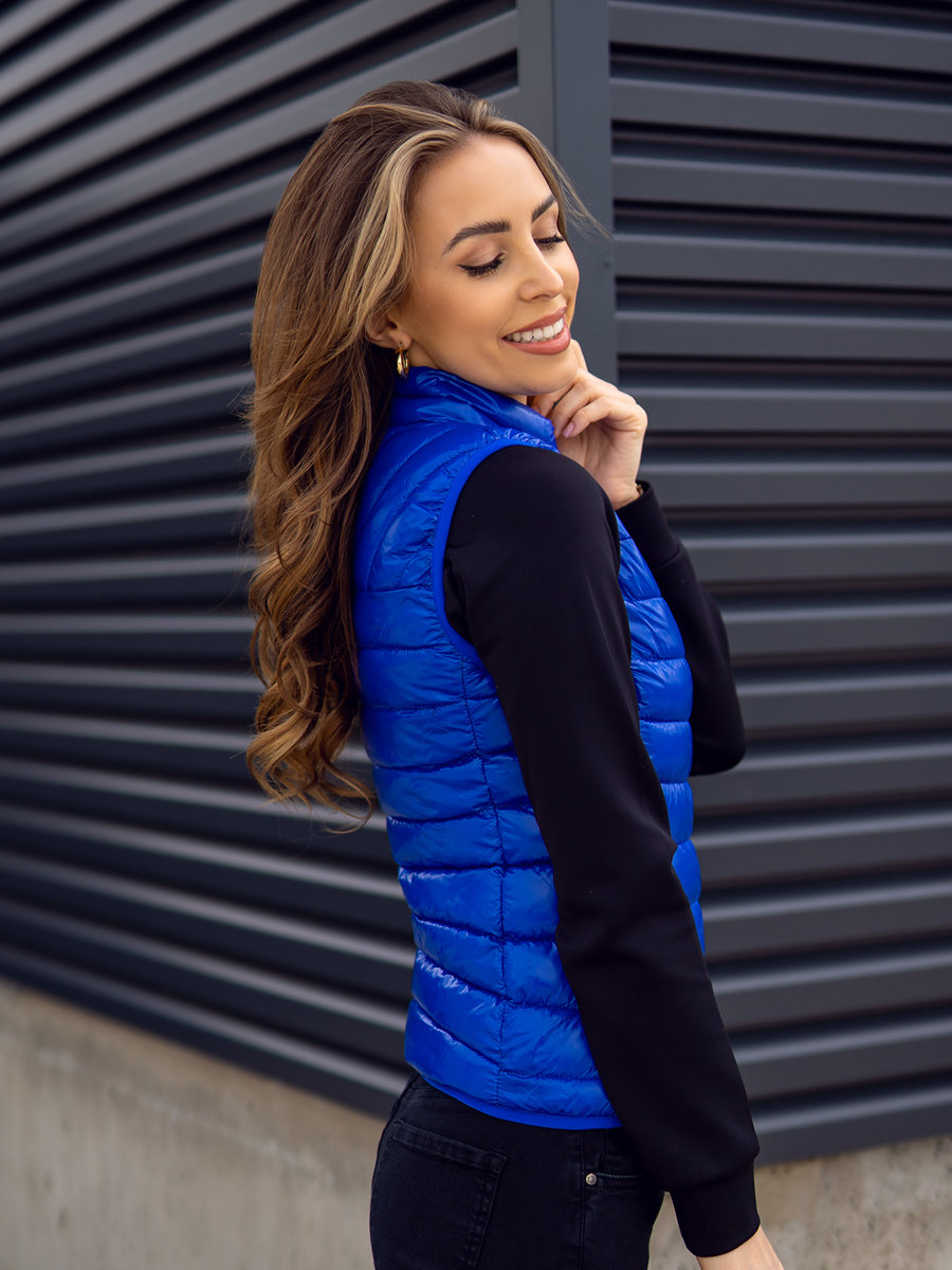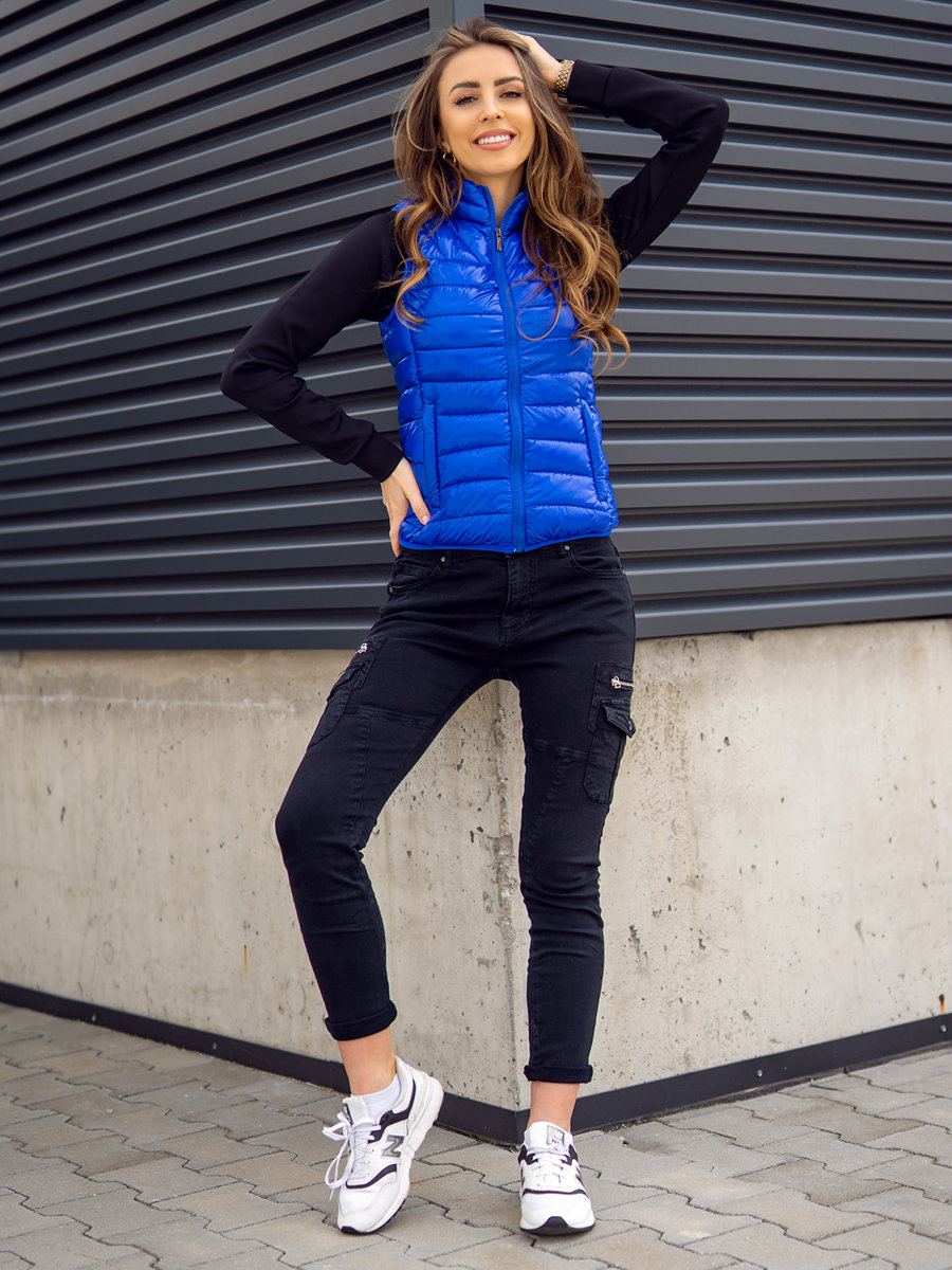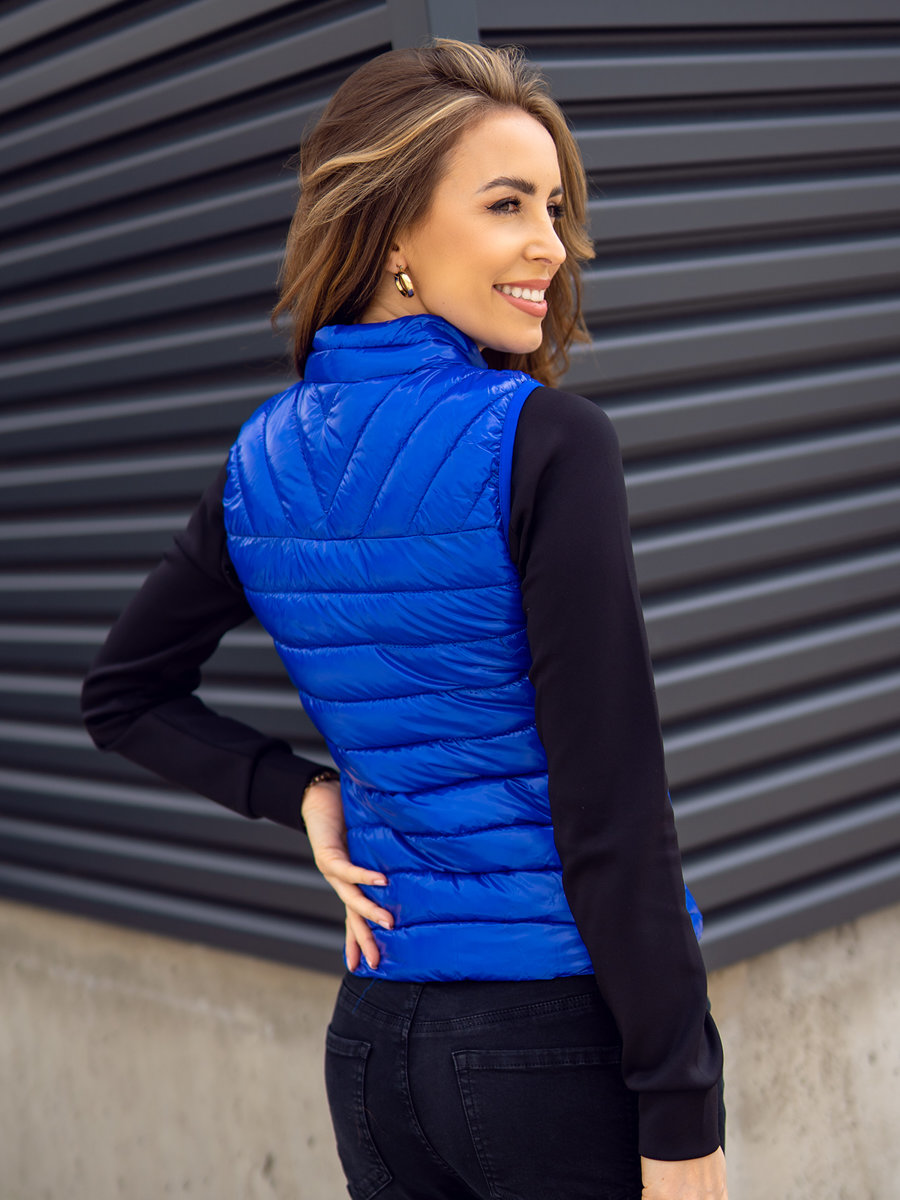 Дамският син ватиран елек от Bolf R0107AA ще бъде идеален за създаване както на спортни, така и на градски стилизации. Капитонирането по цялата повърхност му придава спортен характер. Този модел е с цип и има висока яка. Закопчава се с цип и има два външни джоба с ципове, които му придават практичен характер. Изработен е от 100% найлон, което го прави изключително удобен. Този елек с класическа кройка ще бъде чудесна алтернатива на якето през есенния и пролетния сезон. Може успешно да замени преходното яке или суичъра, осигурявайки защита срещу студ и вятър. Елекът може да се използва като основа за много модни стилове. Ще изглежда страхотно с долнище и суичър , създавайки спортен, свободен outfit. Перфектно се съчетава също и с дънки и T-shirt.