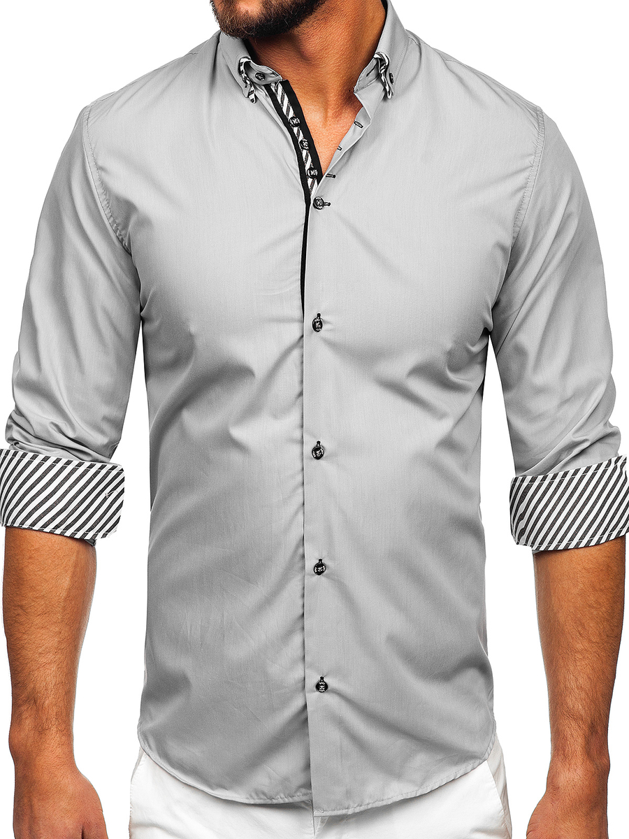 Уникални сиви ризи с дълъг ръкав slim fit Bolf. Те придават сила на стилизациите и изглеждат страхотно с дънки или бежови чино панталони. Сивата мъжка риза има интересна яка и декоративно закопчаване. Може да се облича също и под сако.