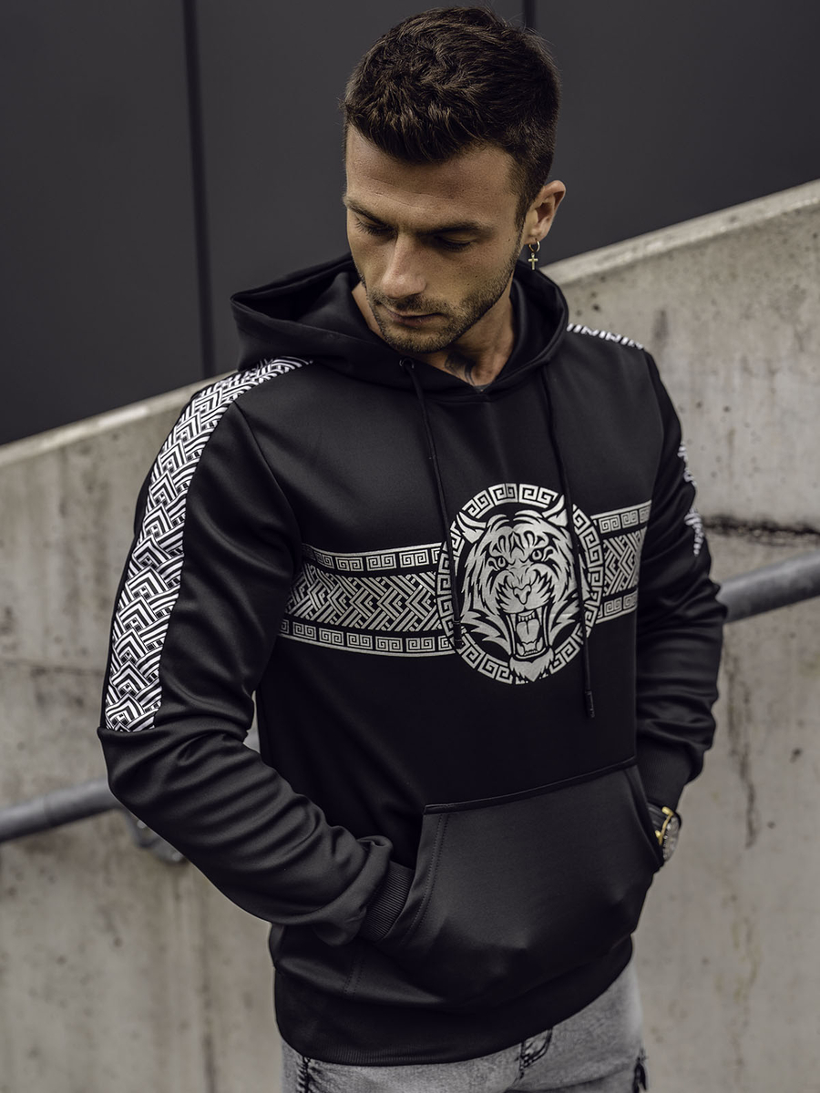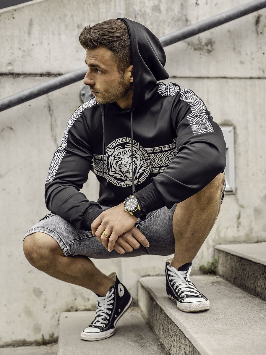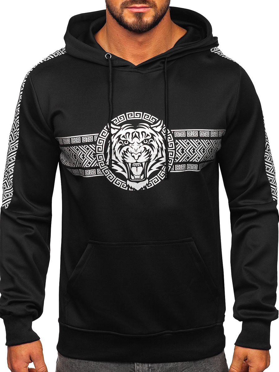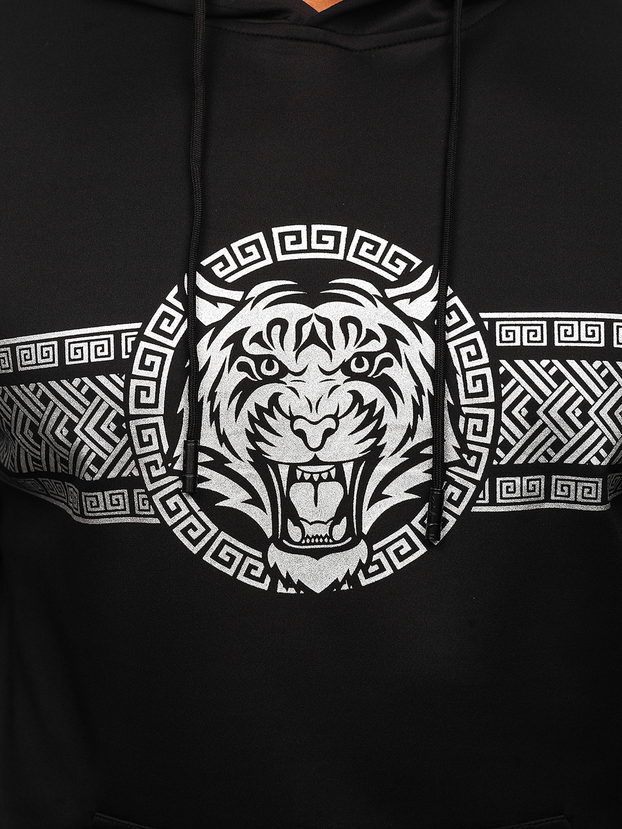 Харесвате ли интересни шарки и тъмни цветове? Мъжкият черен суичър Bolf 8B996 ще бъде идеалният избор за вас. Отличава се с голяма, внимателно изработена щампа с мотив тигър. Чудесно се комбинира с джогъри и спортен елек. Има регулируема качулка, която осигурява отлична защита от студ и дъжд. Материята е завършена с маншет, който позволява по-лесно приспособяване към фигурата. Освен това суичърът е с кенгуру джоб и е изработен от мека материя, която осигурява страхотен комфорт при носене.