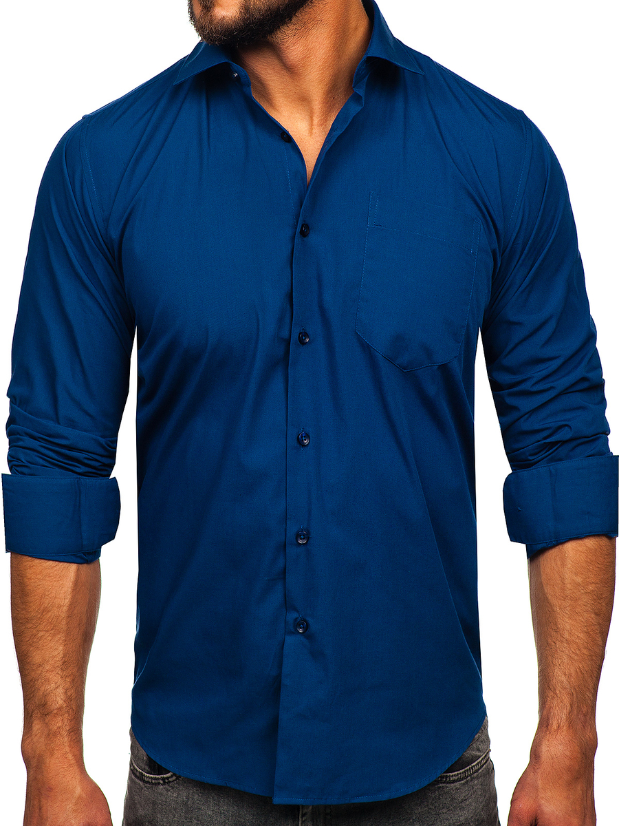 Тъмносинята мъжка елегантна риза с дълъг ръкав от Bolf M14 трябва да присъства в гардероба на всеки елегантен мъж. Риза с дълги ръкави, копчета и италианска яка. Регулируеми маншети, единични, с едно копче. Класическа риза със заоблен подгъв, има малък практичен джоб на гърдите. Идеална за излизане с приятели в клуба, както и по време на важна среща. Основният характер на ризата ви позволява да създавате много стилизации за всеки повод. Създай своята елегантна визия, като съчетаеш ризата с панталони чино и сако Ако искате по-небрежен тоалет, изберете дънки и кожено яке!
